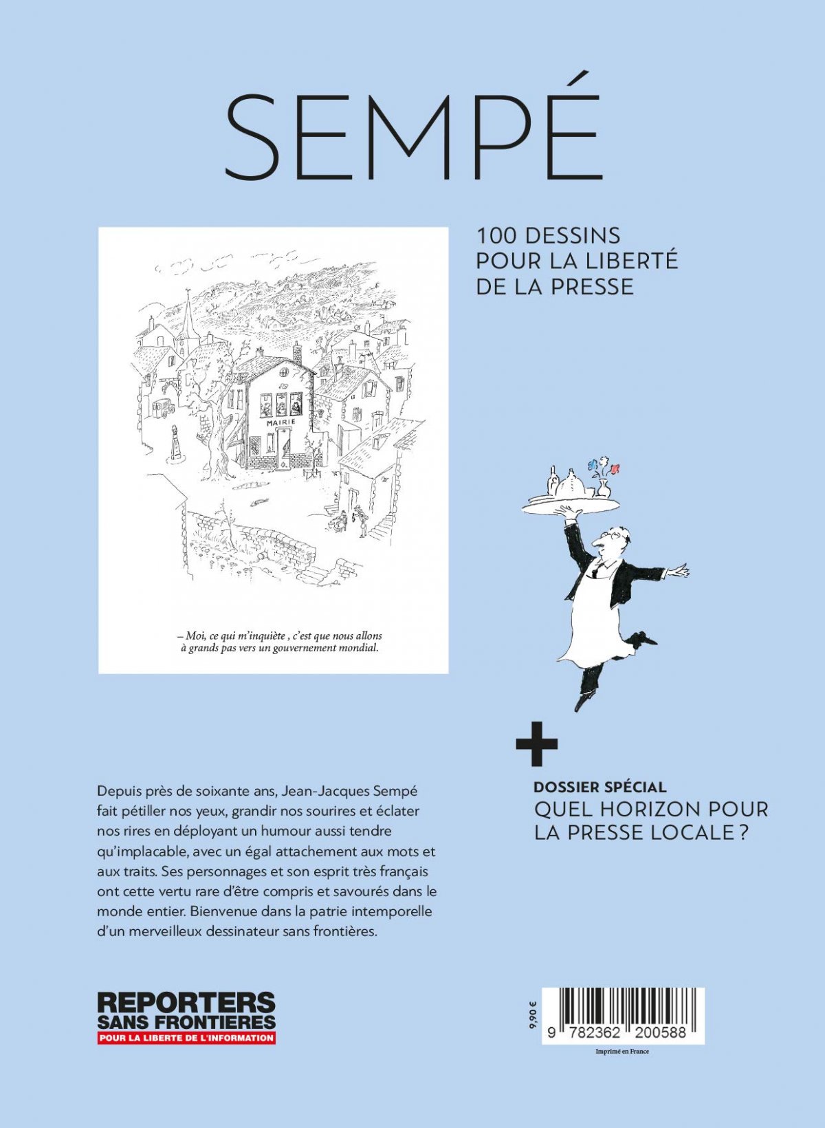 Il fait pétiller nos yeux, grandir nos sourires et éclater nos rires en déployant son humour aussi tendre qu’implacable. Ses dessins et son esprit très français ont cette vertu rare d’être compris et savourés dans le monde entier. Après plus de soixante ans de carrière, de la création du Petit Nicolas en 1960 aux dizaines de couvertures du magazine The New Yorker, Reporters sans frontières (RSF) met à l’honneur dans son 61e album un trésor national vivant, Jean-Jacques Sempé