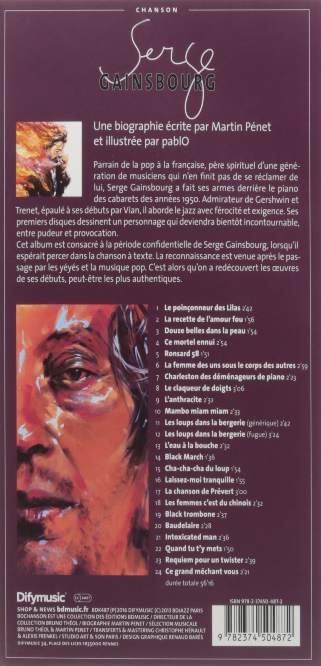 Parrain de la pop à la française, père spirituel d’une génération de musiciens qui n’en finit pas de se réclamer de lui, Serge Gainsbourg a fait ses armes derrière le piano des cabarets des années 1950. Admirateur de Gershwin et Trenet, épaulé à ses débuts pas Vian, il aborde le jazz avec férocité et exigence. Ses premiers disques dessinent un personnage qui deviendra bientôt incontournable, entre pudeur et provocation. Cet album est consacré à la période confidentielle de Serge Gainsbourg, lorsqu’il espérait percer dans la chanson à texte. La reconnaissance est venue après le passage par les yéyes et la musique pop. C’est alors qu’on a redécouvert les oeuvres de ses débuts, peut-être les plus authentiques.