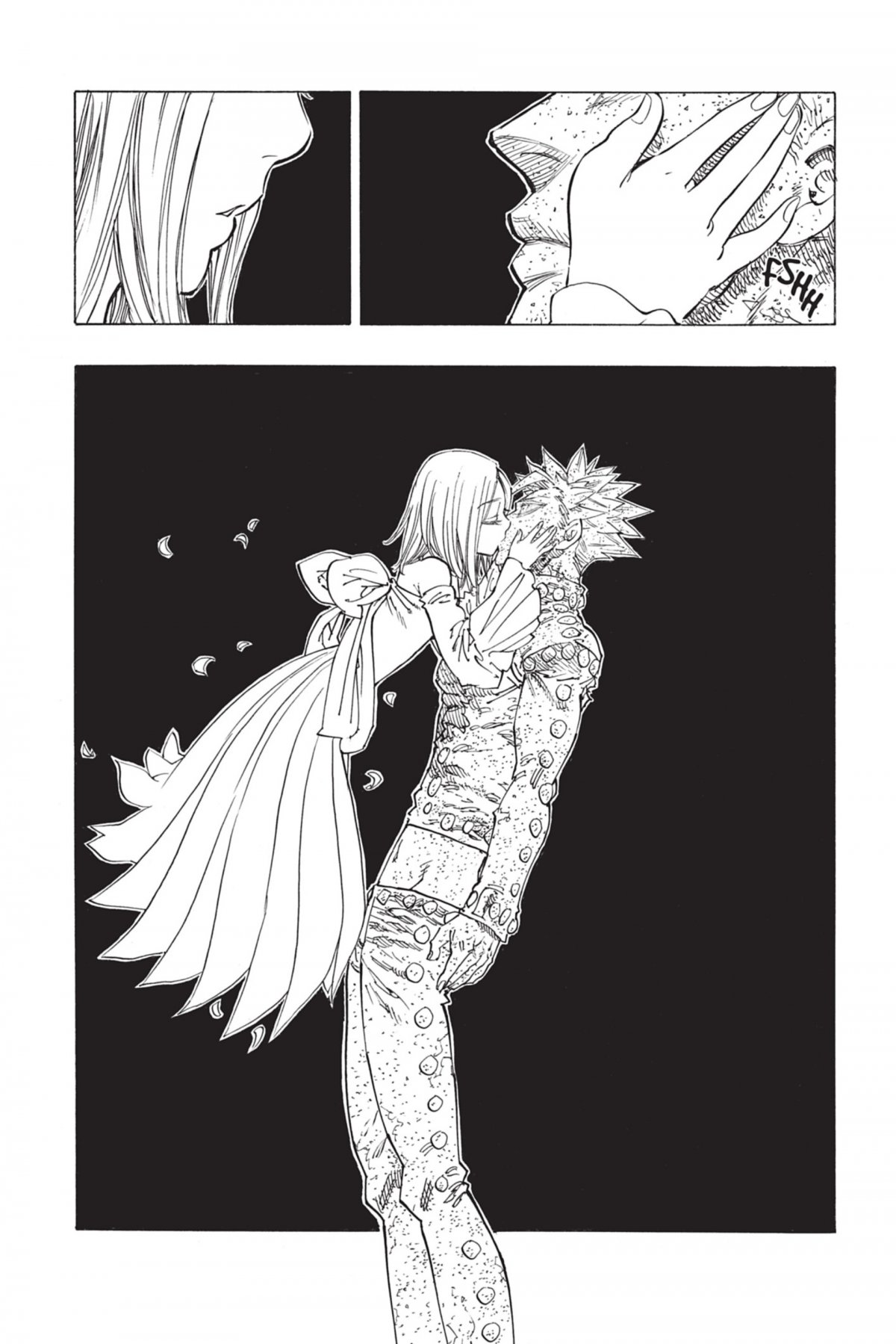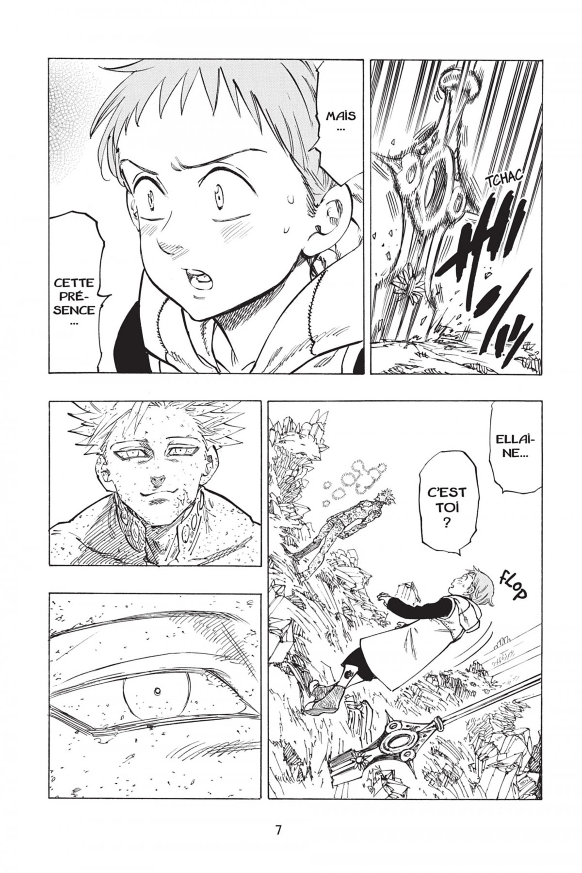 Meliodas et toute la troupe ont réussi à entrer dans la Capitale des Défunts. Très vite, un combat s’engage entre Ban et King, car ce dernier accuse son ancien camarade d’avoir tué Ellaine, sa soeur cadette. Mais alors que King avait lancé sur Ban un sort de pétrification, Ellaine intervient pour le libérer. Elle supplie son frère de protéger Ban, et King réintègre donc les Seven Deadly Sins, balayant au passage Guila, un chevalier sacré qui donnait du fil à retordre aux trois autres. Il est maintenant temps pour la petite bande de partir à la recherche de leurs reliques, des armes qui leur confère des pouvoirs magiques phénoménaux !