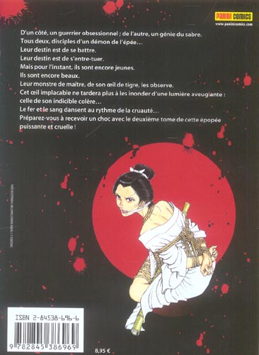 D’un côté, un guerrier obsessionnel, de l’autre, un génie du sabre. Tous deux disciples d’un démon de l’épée. Leur destin est de se battre. Leur destin est de s’entre-tuer. Mais pour l’instant, ils sont encore jeunes. Ils sont encore beaux. Leurs monstre de maître, de son o eil de tigre, les observe. Cet o eil implacable ne tardera plus à les inonder d’une lumière aveuglante : celle de son indicible colère. Le fer et le sang dansent au rythme de la cruauté. Préparez-vous à recevoir un choc avec le deuxième tome de cette épopée puissante et cruelle !