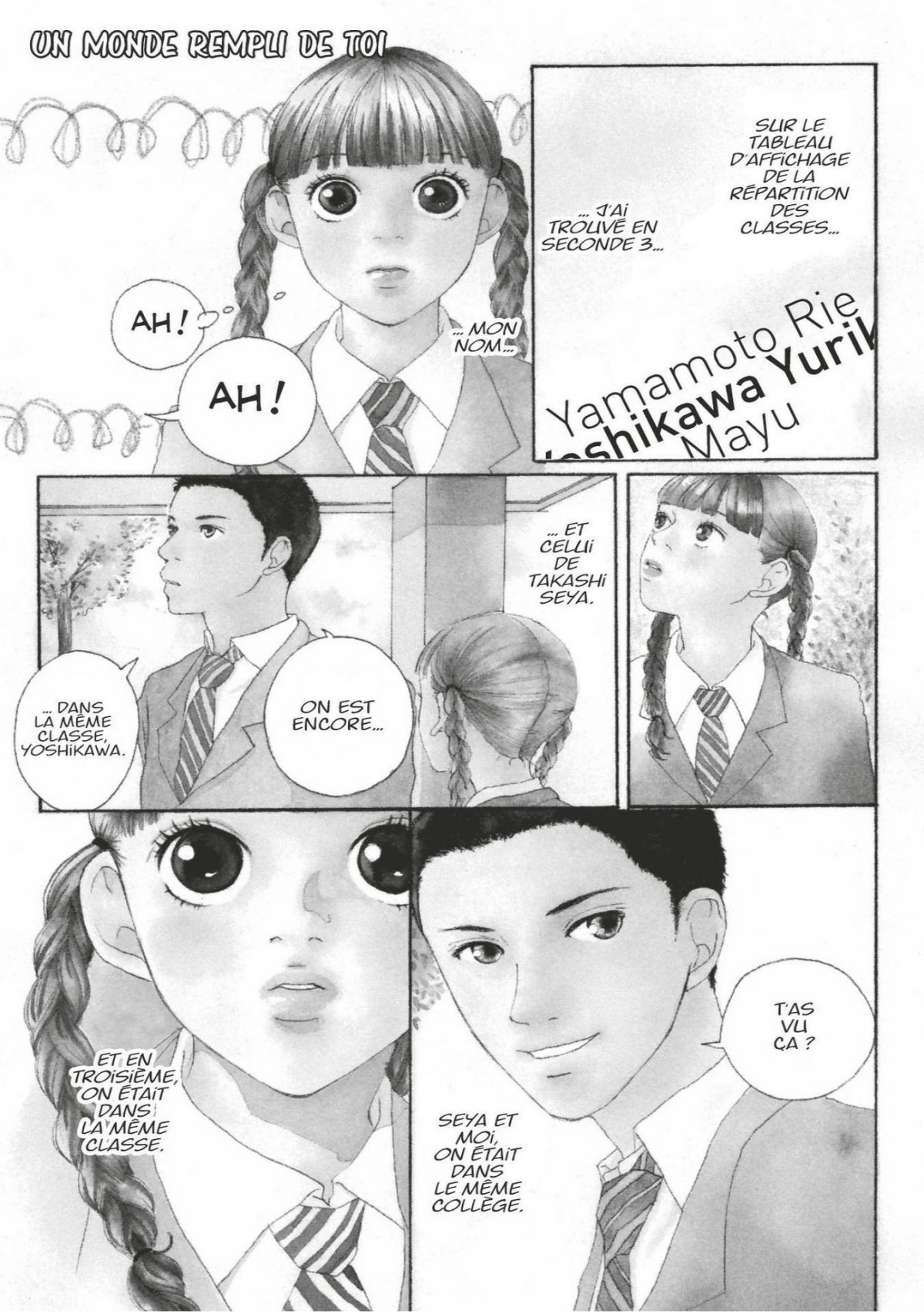 Le premier tome de « Short love stories » démarre avec cette histoire « Un monde rempli de toi ». Elle est suivie de nombreux autres chapitres mettant en scène des histoires courtes inédites en France de Io Sakisaka.