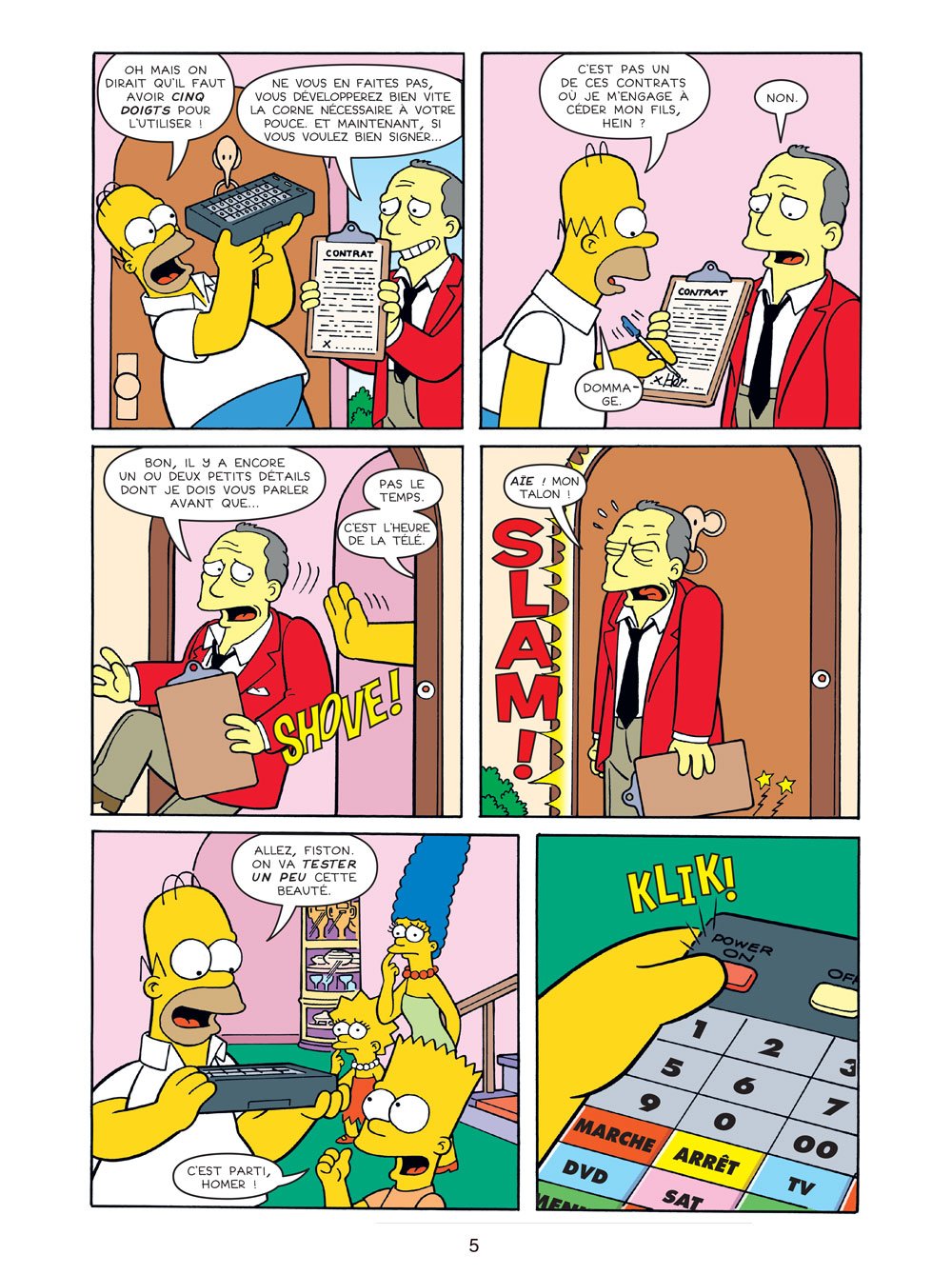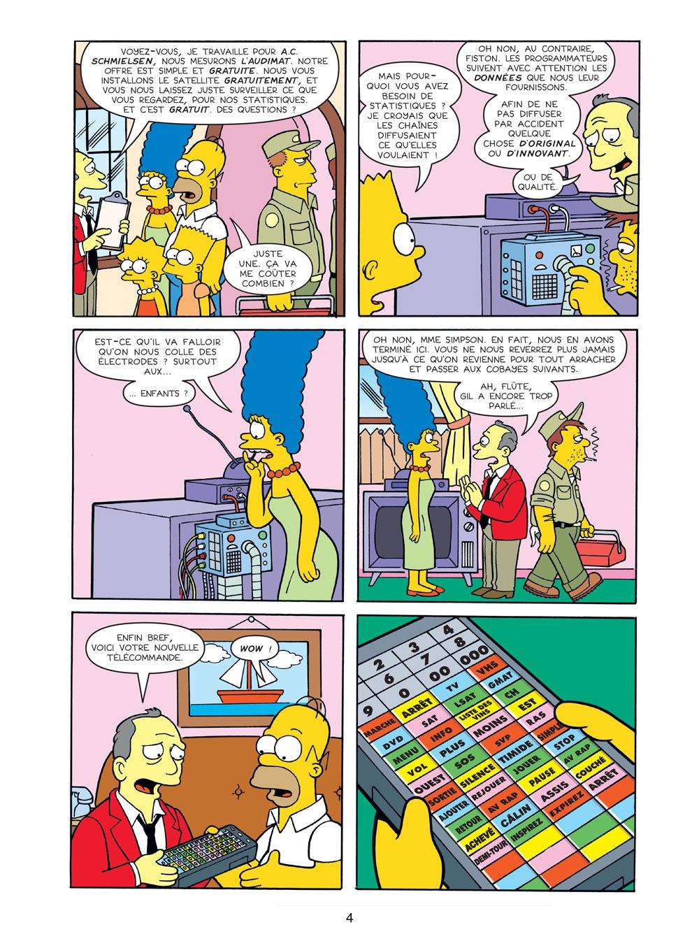 Quel scandale ! On vient de retirer le câble chez Les Simpson. Comment Homer et Bart vont-ils pouvoir survivre ?? Grâce à l’offre incroyable que leur propose une agence de relevé d’audimat. Pas moins de 5000 chaînes à regarder gratuitement ! En échange, il suffit aux Simpson, d’accepter d’être surveillés par cette agence afin de connaitre leurs pratiques télévisuelles. Mais les statistiques vont vite révéler qu’ils sont LA famille type qui regarde tous les programmes les plus populaires de la nation. Ils deviennent ainsi un modèle à suivre. Pour eux, terminé l’originalité. Tous le monde les imite et ils en deviennent banals. Mais les Simpson ne comptent pas se laisser faire ! ? Lisa au centre ? : Quelle étrange machine ?? Un test de psychologie qui diagnostique pour vous tous vos troubles de la personnalité. Si la plupart des membres de la famille Simpson sont affecté par des troubles classiques (cleptomanie, égocentrisme.), Lisa se voit attribuer le syndrome du centre. Dans une famille de trois enfants, celui du milieu se retrouve souvent le moins écoutés par ses parents et risque de graves séquelles. Pour y remédier, Homer décide d’adopter un quatrième enfant, Nelson, la terreur de l’école ?!?On vous laisse imaginer les conséquences de ce choix.