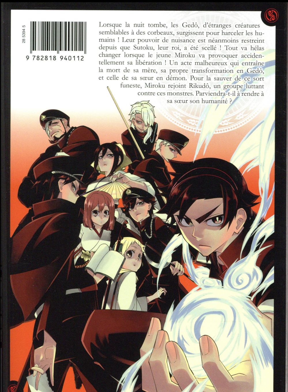 Lorsque la nuit tombe, les Gedô, d’étranges créatures semblables à des corbeaux, surgissent pour harceler les humains ! Leur pouvoir de nuisance est néanmoins restreint depuis que Sutoku, leur roi, a été scellé ! Tout va hélas changer lorsque le jeune Miroku va provoquer accidentellement sa libération ! Un acte malheureux qui entraîne la mort de sa mère, sa propre transformation en Gedô, et celle de sa soeur en démon. Pour la sauver de ce sort funeste, Miroku rejoint Rikudô, un groupe luttant contre ces monstres. Parviendra-t-il à rendre à sa soeur son humanité ?