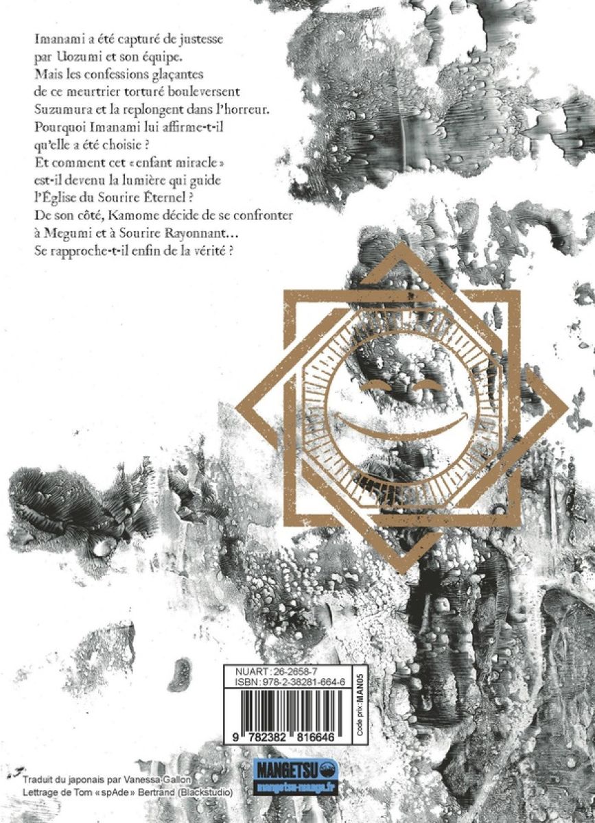 Imanami a été capturé de justesse par Uozumi et son équipe. Mais les confessions glaçantes de ce meurtrier torturé bouleversent Suzumura et la replongent dans l’horreur. Pourquoi Imanami lui affirme-t-il qu’elle a été choisie ? Et comment cet « enfant miracle » est-il devenu la lumière qui guide l’Église du Sourire Éternel ?