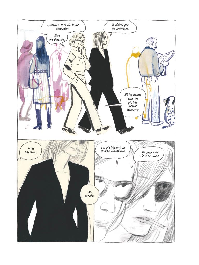 1966. Dans la quiétude de son atelier avenue Marceau, Yves Saint Laurent travaille à son bureau. Il dessine. Des recherches pour sa prochaine collection. Le dessin qui l’absorbe totalement représente une femme... en smoking !Un an plus tard, sa muse de toujours, Betty Catroux porte ce smoking et se voit interdire l’entrée des restaurants newyorkais. Une femme en smoking, vous n’y pensez pas ?!De déambulations en rencontres inopinées, ce récit imaginaire va mettre sur le chemin d’Yves Saint Laurent et Betty Catroux, historiens, rock stars, premiers d’atelier ou créatrice de mode... Leurs échanges dissèquent ce vêtement tellement iconique et sa contribution dans l’évolution de la femme moderne.