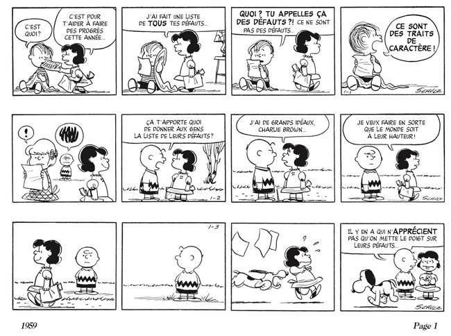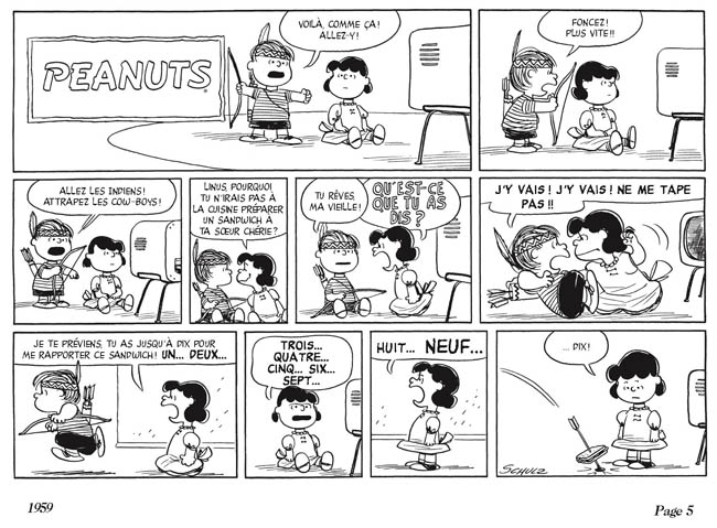 Cinquieme volume de la réédition événement des Peanuts. Un must de la bande dessinée qu’il faut absolument LIRE pour en comprendre le génie. Ni plus ni moins. Ici se conclut la premiere décennie des Peanuts. Un personnage fait son entrée : la petite soeur de Charlie Brown, Sally, depuis la fiere annonce de sa naissance par son frere jusqu’a ses premiers pas (et son béguin pour Linus) ! Et aussi la toute premiere séquence consacrée a la "Citrouille Géante", la premiere apparition de Lucy derriere son stand de psychiatre, la courte passade sans retour de Linus pour son institutrice bien-aimée, et le combat de Snoopy contre la construction d’une autoroute qui menace sa niche.