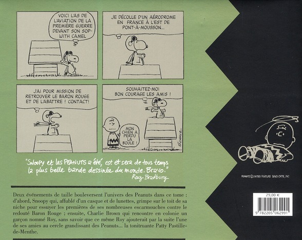 Deux énormes événements surviennent dans le monde des Peanuts dans ce volume : pour la premiere fois, Snoopy se met un casque sur la tete, grimpe sur sa niche et se transforme en Baron Rouge ! Puis, lors d’un séjour en colonie de vacances, Charlie Brown se fait un nouvel ami, Roy, sans se douter que ce dernier apportera un nouvel acteur tragi-comique au petit monde en constante expansion des Peanuts, a savoir son amie Patty Pastille-de-menthe !