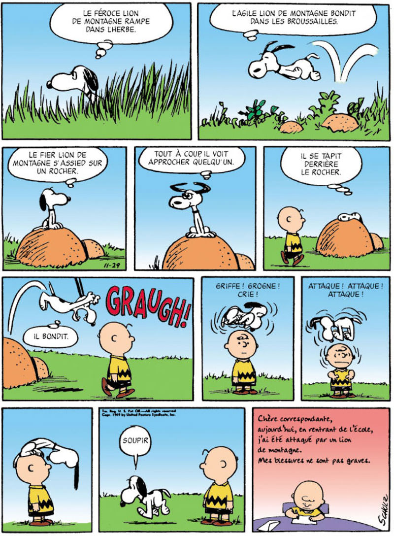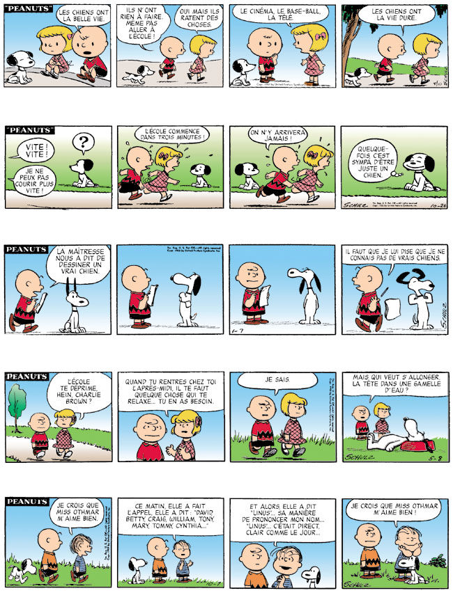 En septembre, pour tous les enfants, c’est la rentrée des classes. C’est vrai aussi pour certains chiens ! Ceux qui tapent a la machine, ont une passion pour le baron rouge, et adorent dormir sur le toit de leur niche. Savourons donc cette compilation des meilleurs strips de Snoopy dans l’enfer scolaire.