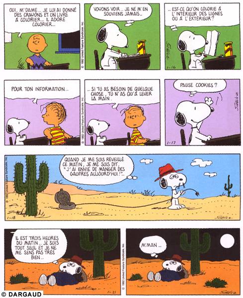 Décidément, les Peanuts ont des sujets de méditation, ces temps-ci : Sally perd ses dents et les met sous l’oreiller comme tout le monde, mais elle apprend que la souris envoie les dents qu’elle ramasse a une usine de boules de billard. Est-ce correct ? Snoopy, lui, a le vague souvenir d’un rat qui venait chercher ses crocs quand il était petit. Et a propos d’enfance, il s’est remis a son roman : "Je viens d’une famille tres pauvre. Nous étions si pauvres que nous mangions de la pâtée pour chats. Nous en sommes tous morts." En fait, il semblerait que personne ne soit mort, mais le chat était furax. Et maintenant, Snoopy est obsédé de cookies. C’est comme ça, quand on a été pauvre