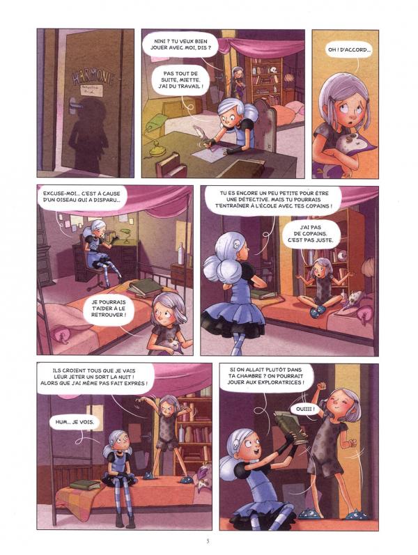 Depuis qu’elle a résolu le mystère du jeteur de sorts, Harmonie a pris goût à l’activité de détective. Et ses condisciples ne se privent pas de la solliciter. C’est le cas par exemple de Vittorino. Le pauvre a perdu son chat. Désespéré de le revoir, il supplie Harmonie de retrouver sa trace. Au fil de son enquête, l’oeil aux aguets du moindre indice, Harmonie observe des comportements étranges chez certains de ses camarades. Il y a d’abord Esteban qu’elle voit échanger avec Rowena un gros livre de contes contre un maigre sachet de bonbons. Elle ne le savait pas si gourmand. Il y a cette même Rowena qui, sous la menace, accepte de céder une partie de ses friandises à Vittorino. Depuis quand Vittorino fait-il peur aux filles ?... Et auparavant, il y avait eu ce troublant épisode : tandis que Miette et Harmonie s’amusaient aux pirates, elles avaient vu le décor de leur jeu comme aspiré par une force mystérieuse. Et comme par hasard, Vittorino et Rowena se trouvaient dans les parages. Foi de détective, il y a derrière cette nouvelle mission bien plus qu’une histoire de chat perdu à résoudre !