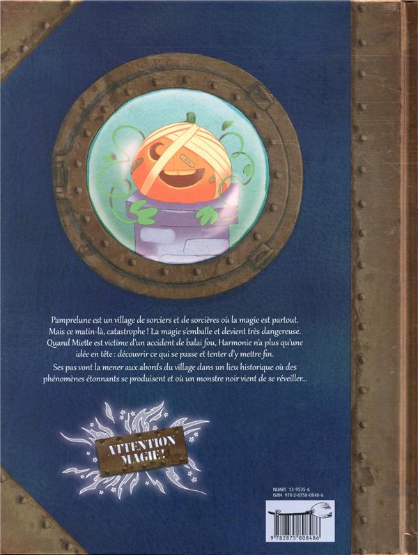 Pamprelune est un village de sorciers et de sorcières où la magie est partout. Mais ce matin-là, catastrophe ! La magie s’emballe et devient très dangereuse. Quand Miette est victime d’un accident de balai fou, Harmonie n’a plus qu’une idée en tête : découvrir ce qui se passe et tenter d’y mettre fin. Ses pas vont la mener aux abords du village dans un lieu historique où des phénomènes étonnants se produisent et où un monstre noir vient de se réveiller...