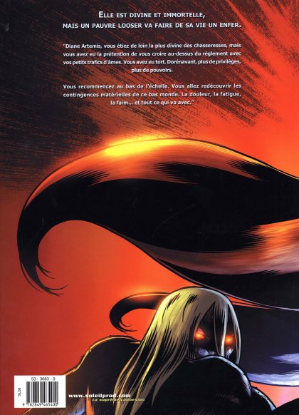 Diane Artemis, vous étiez de loin la plus divine des chasseresses, mais vous avez eu la prétention de vous croire au-dessus du règlement avec vos petits trafics d’âmes. Vous avez eu tort. Dorénavant, plus de privilèges, plus de pouvoirs. Vous recommencez au bas de l’échelle. Vous allez redécouvrir les contingences matérielles de ce bas monde. La douleur, la fatigue, la faim et tout ce qui va avec.