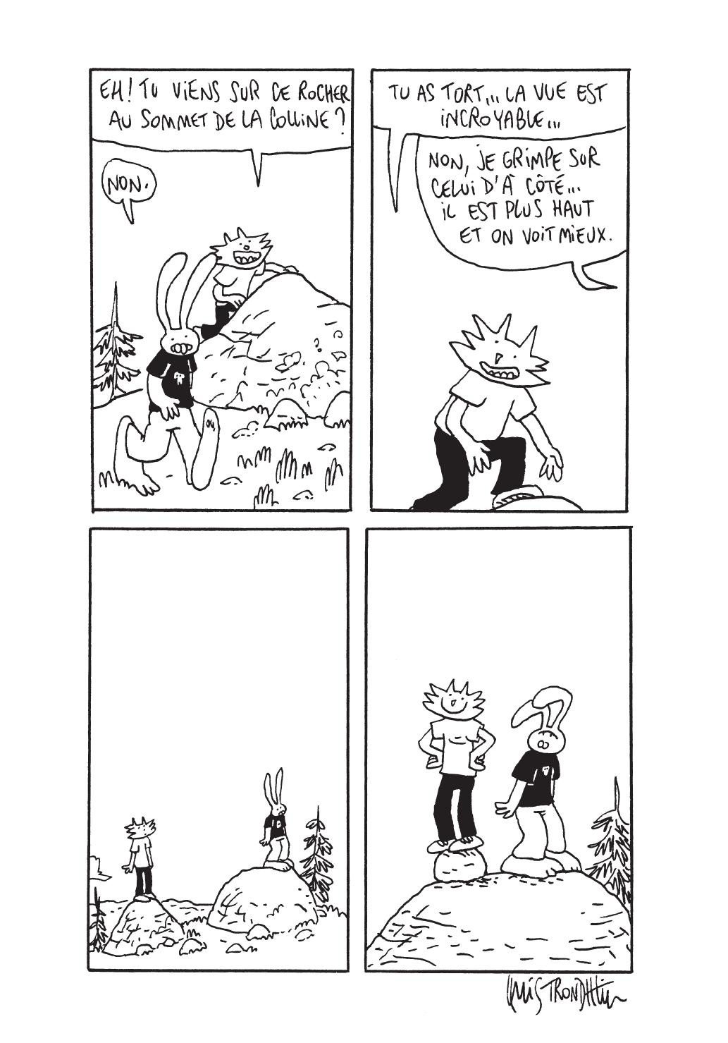 Dans un monde post-covid, Lapinot philosophe sur l’univers et l’hasardeuse destinée d’un caillou tandis que Richard est obsédé par le mystérieux affaissement du macadam… Dans Sous le trottoir, les répliques fusent et font mouche, comme si, face à un monde absurde, l’humour était plus que jamais nécessaire.