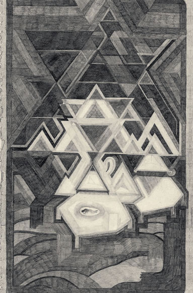 Sous le trait tendre à la finesse chirurgicale de Doublebob apparaissent, au fil des 36 pages de ce curieux opus-cule, des figures qui défilent de manière à former l’étrange récit d’un voyage souterrain. Des portes s’ouvrent, des toiles se fissurent et des fentes s’élargissent toujours assez pour laisser le lecteur basculer dans les profondeurs, sans qu’il sache exactement de quoi est fait le sol qui le surplombe. Si la terre semble meuble, les hauteurs paraissent solides et opaques. Les sous-sols sont parsemés de triangles. Ce motif géométrique récurrent, symbole de la stabilité et de la construction architecturale dans toute la signalétique contemporaine offre tout d’abord une impression de sécurité. II est avant tout la tente sous lequel le personnage se réfugie en position foetale, comme protégé par une trinité mystique. Cependant cet abri se présente peu à peu sous son jour précaire, et ne cesse d’offrir à la vue du lecteur les fissures qui le déchirent, la grande légèreté de sa toile et les dangers qui guettent son locataire. Des escaliers et des échelles se déploient en deça du sol et de nouvelles dimensions se créent, dans lesquelles les matières circulent aisément sur des parcours fléchés par l’auteur.