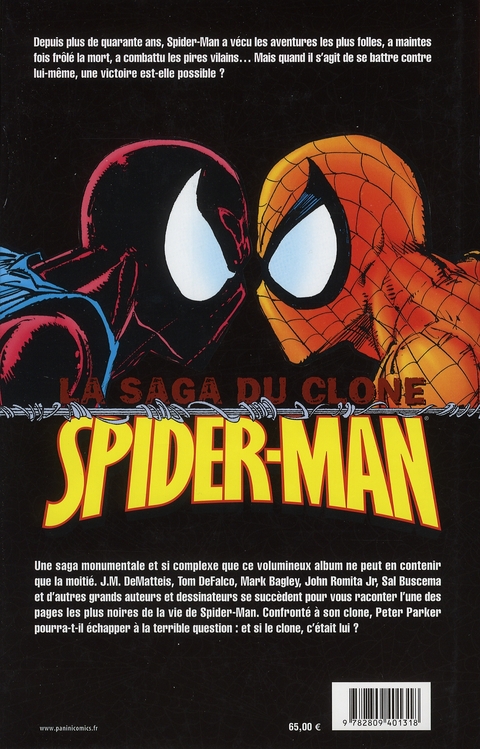 Depuis plus de quarante ans, Spider-Man a vécu les aventures les plus folles, a maintes fois frôlé la mort, a combattu les pires vilains... Mais quand il s’agit de se battre contre lui-même, une victoire est-elle possible ? Une saga monumentale et si complexe que ce volumineux album ne peut en contenir que la moitié. J.M. DeMatteis, Tom DeFalco, Mark Bagley, John Romita Jr, Sal Buscema et d’autres grands auteurs et dessinateurs se succèdent pour vous raconter l’une des pages les plus noires de la vie de Spider-Man. Confronté à son clone, Peter Parker pourra-t-il échapper à la terrible question : et si le clone, c’était lui
