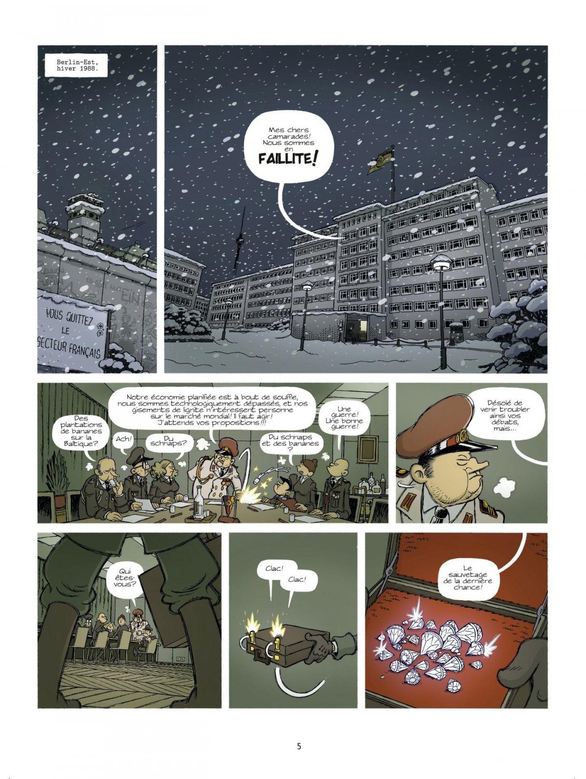 Spirou et son compère comprennent rapidement qu’il a été embarqué malgré lui en RDA et vont se mettre sur sa piste. Mais traverser la frontière la plus protégée d’Europe ne va pas être facile. La Stasi, police politique de la dictature communiste, veille au grain. Et l’ombre d’un vieil ennemi plane sur Berlin coupée en deux.