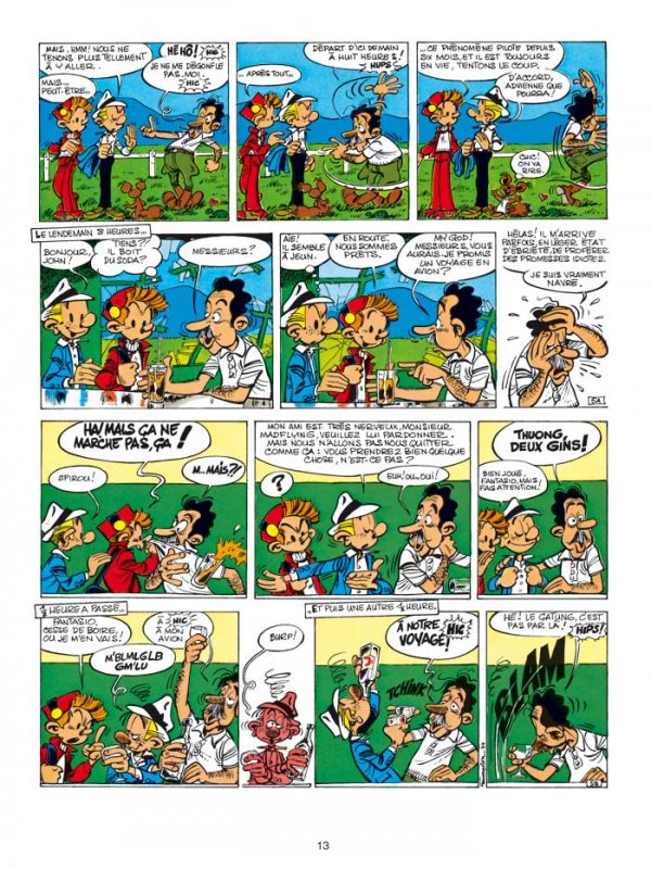 Spirou et Fantasio tombent, au sens premier du terme, sur un convoi gagnant la capitale. Dans la confusion, ils sont séparés et Fantasio se retrouve nez à nez avec son sosie, à quelques années et kilos près. Le quidam n’est autre que l’inspecteur général de l’Organisation pour l’Asie. La mafia, quoi