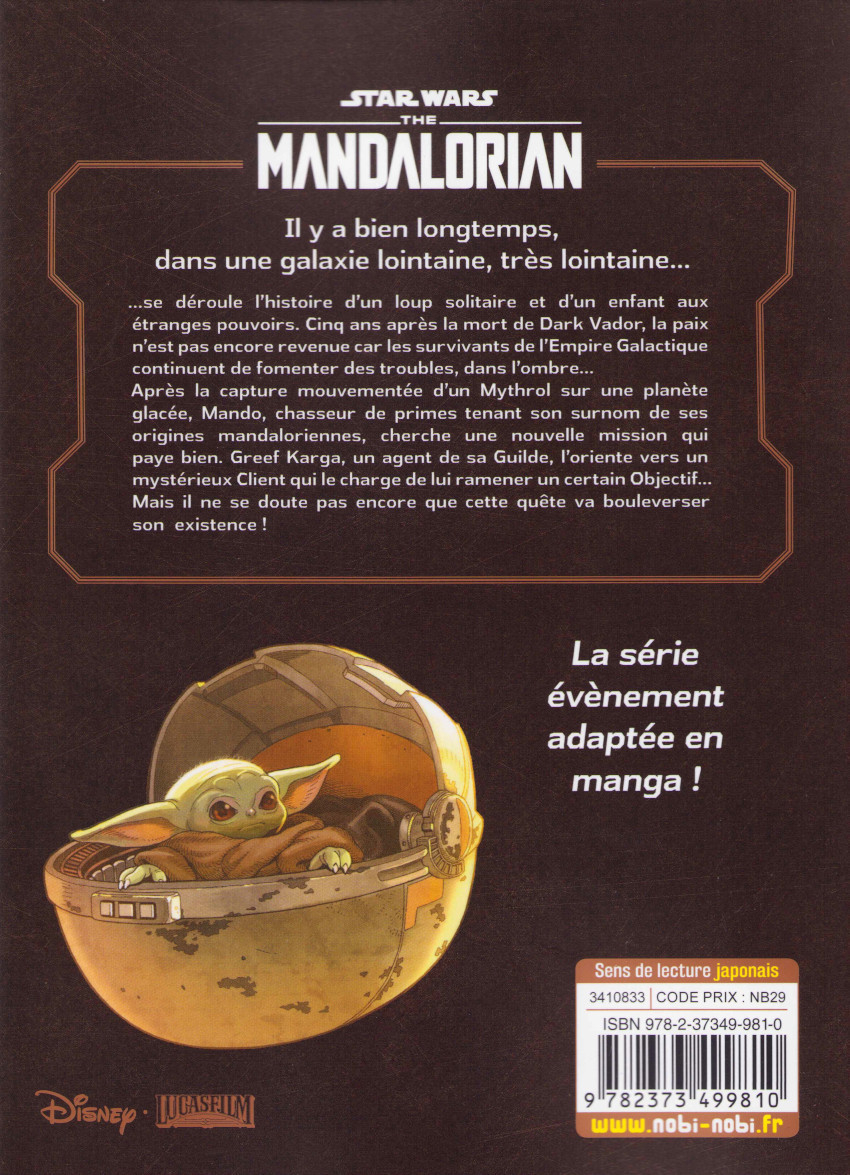 Il y a bien longtemps, dans une galaxie lointaine, très lointaine... ...se déroule l’histoire d’un loup solitaire et d’un enfant aux pouvoirs étranges. Cinq ans après la mort de Dark Vador, la paix n’est pas encore revenue car les survivants de l’Empire Galactique continuent de fomenter des troubles, dans l’ombre... Après la capture mouvementée d’un Mythrol sur une planète glacée, Mando, chasseur de primes tenant son surnom de ses origines mandaloriennes, cherche une nouvelle mission qui paye bien. Greef Karga, un agent de sa Guilde, l’oriente vers un mystérieux Client qui le charge de lui ramener un Objectif... mort ou vif. Mando ne sait pas encore que cette quête va bouleverser son existence !