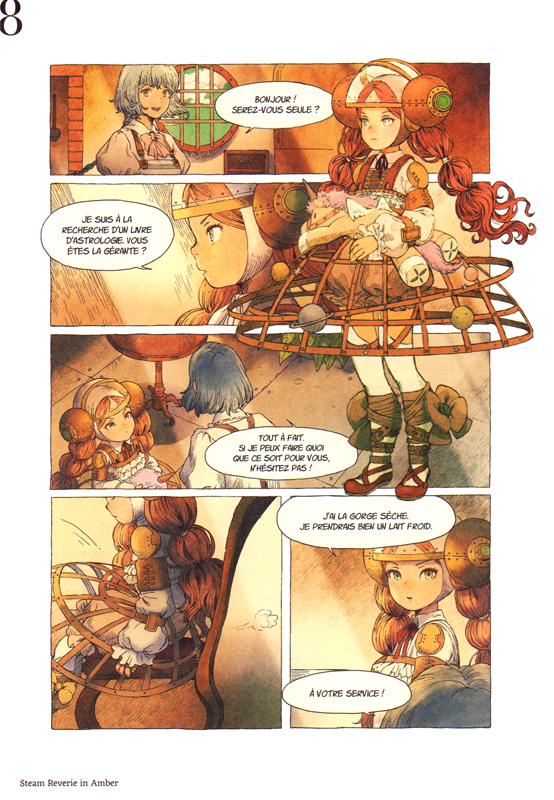 Steam Reverie in Amber est une immersion pleine et entière dans l’uchronie steampunk. Un immense vaisseau flottant abrite serre, laboratoire, bibliothèque et salle des machines, tandis que le panache de vapeur qui le propulse se confond avec les nuages... À mi-chemin entre l’artbook, le beau livre et le manga, Steam Reverie in Amber dépeint tous les détails de cet univers à vapeur : costumes d’inspiration victorienne, accessoires et instruments, design du vaisseau et de ses composants, des ailes mécaniques au réseau de vapeur, scènes de vie à bord...