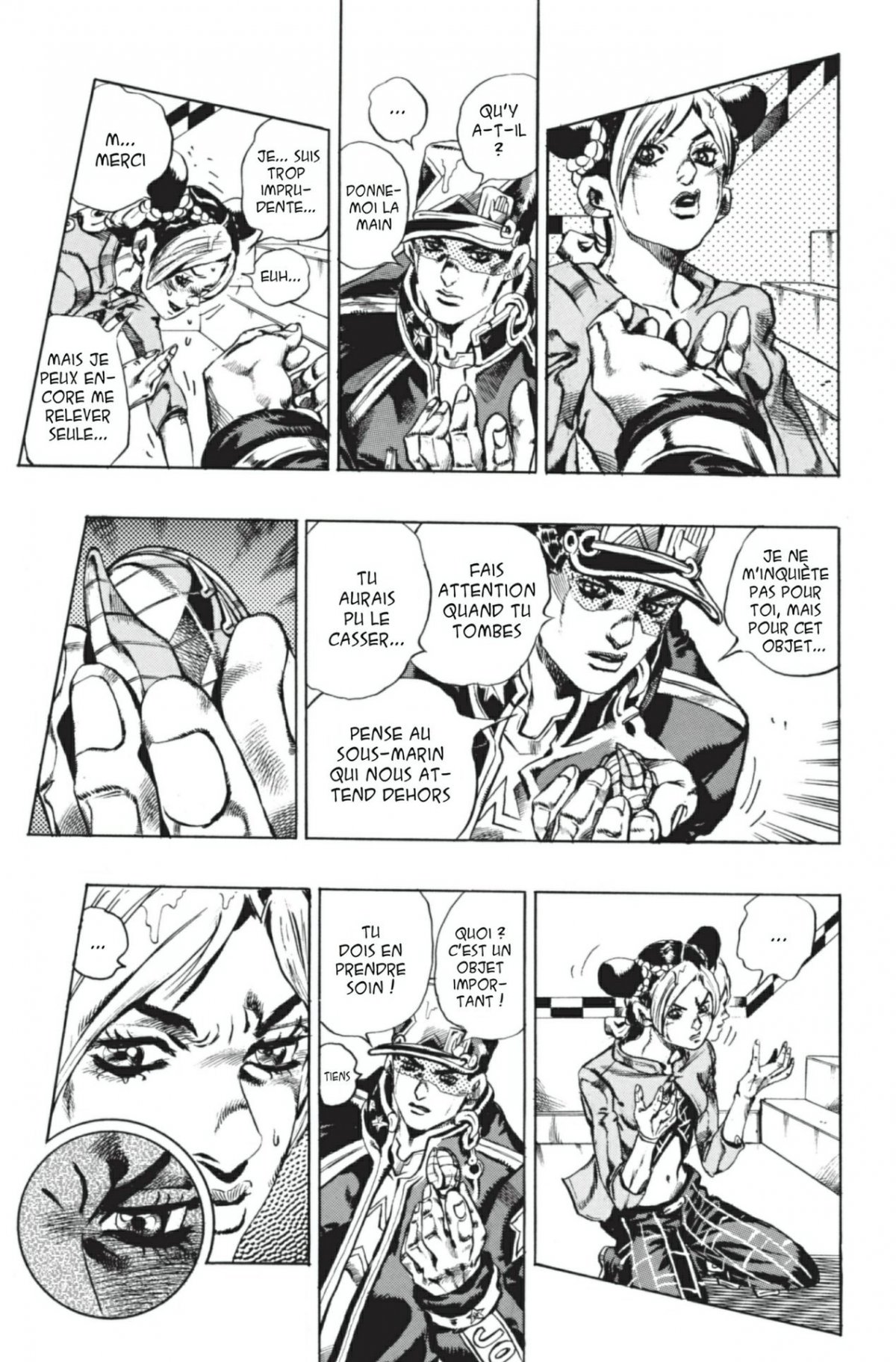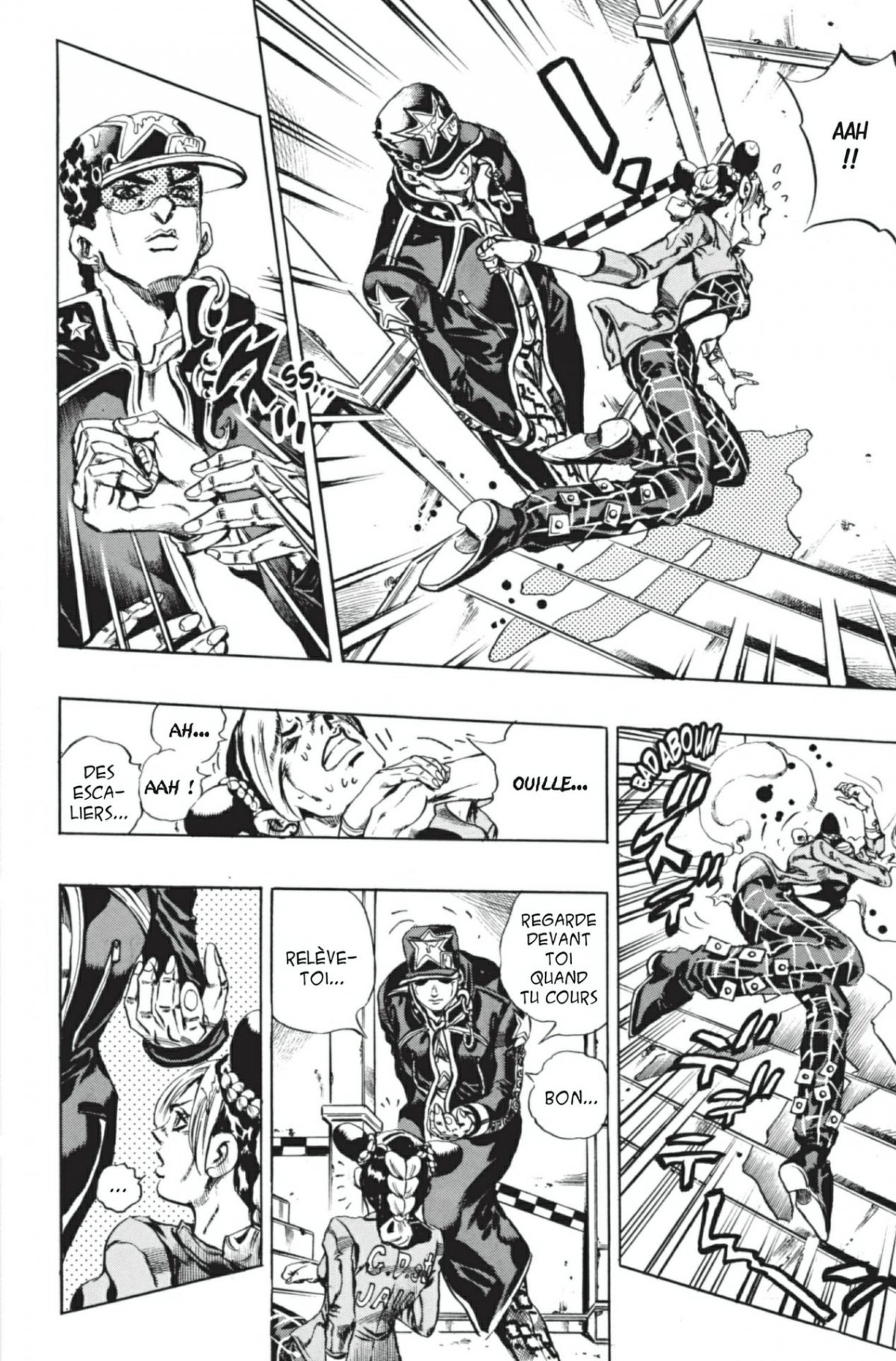 Venu pour faire évader Jolyne de prison, Jotaro tombe avec elle sous l’emprise d’une illusion qui leur fait croire qu’ils luttent contre un ennemi, alors qu’en réalité leur corps est en train de fondre ! Ils parviennent à s’échapper de ce cauchemar, mais leur adversaire dérobe le Stand de Jotaro...