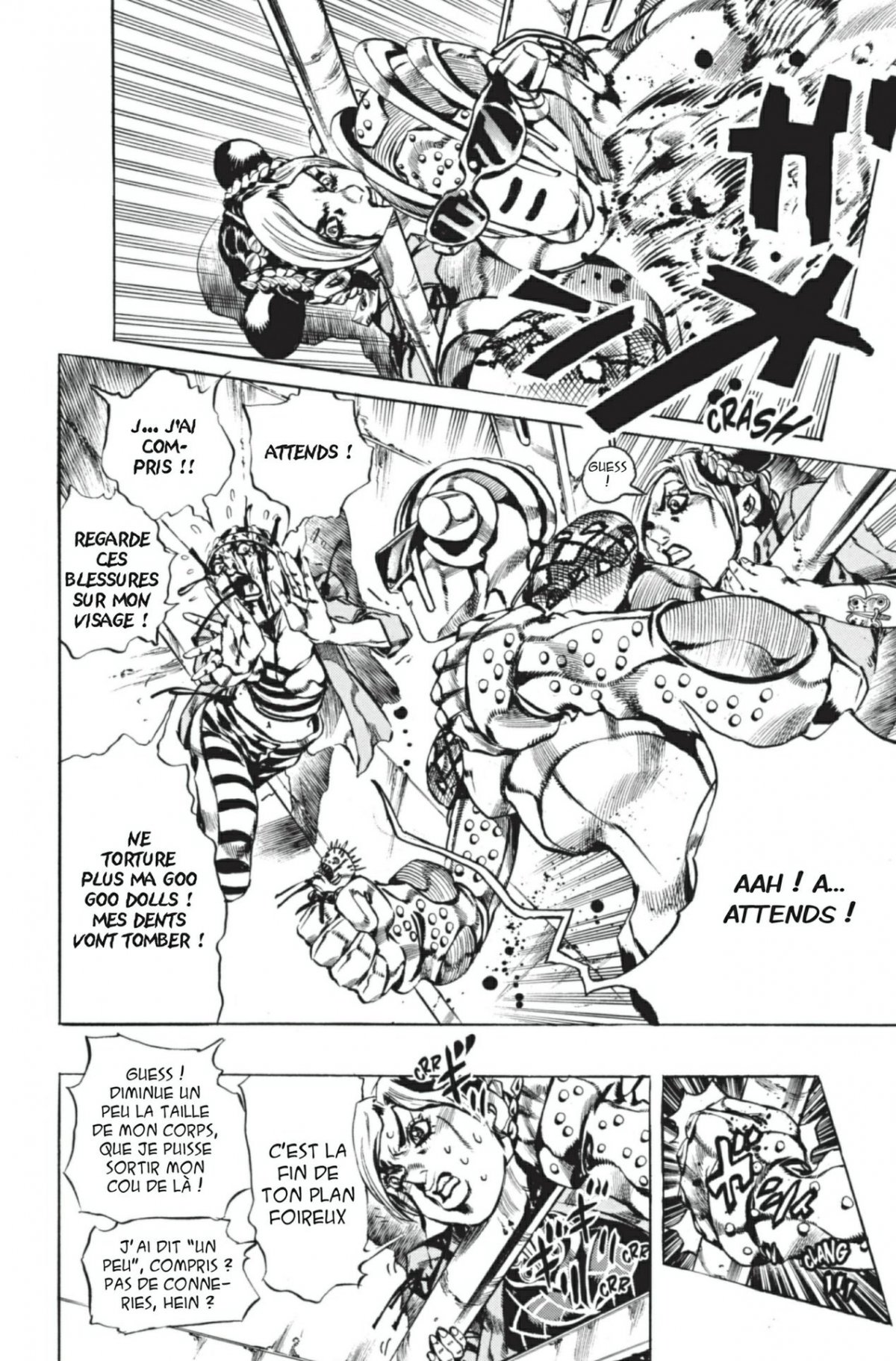 Stone Free, le Stand de Jolyne a détruit Goo Goo Dolls, celui de Guess. Après quoi, Jolyne reçoit un avertissement de la part d’un étrange garçon. Selon lui, elle ne doit pas aller à la rencontre d’une personne venue lui rendre visite. Qui est donc ce jeune garçon ? Et ce mystérieux visiteur ?