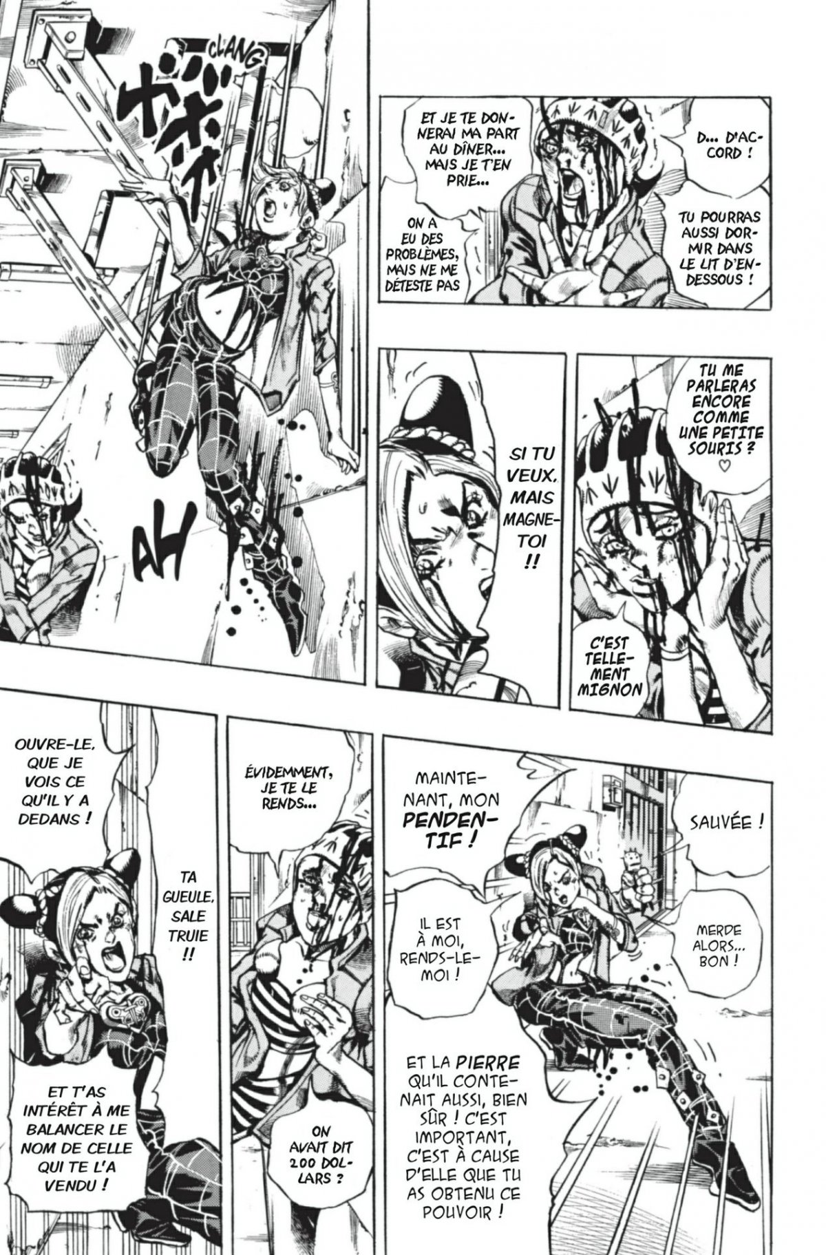 Alors que Joline commence à peine à se faire à sa condition de détenue et à son nouveau pouvoir, son stand, elle reçoit une visite inattendue : celle de Jotaro, son père ! Ce dernier vient la prévenir du danger qu’elle court à Green Dolphin. En effet, quelqu’un l’y a fait incarcérer à dessein pour l’éliminer pour de bon..