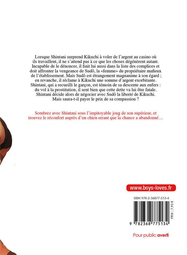Lorsque Shintani surprend Kikuchi à voler de l’argent au casino où ils travaillent, il ne s’attend pas à ce que les choses dégénèrent autant. Incapable de le dénoncer, il finit lui aussi dans la liste des complices et doit affronter la vengeance de Sudô, la ""femme"" du propriétaire mafieux de l’établissement. Mais Sudô est étrangement magnanime à son égard ; en revanche, il réclame à Kikuchi une somme d’argent exorbitante. Shintani, qui a recueilli le garçon, est témoin de sa descente aux enfers : du vol à la prostitution, il sent bien que cette dette va lui être fatale. Shintani décide alors de négocier avec Sudô la liberté de Kikuchi. Mais saura-t-il payer le prix de sa compassion ?Sombrez avec Shintani sous l’impitoyable joug de son supérieur, et trouvez le réconfort auprès d’un chien errant que la chance a abandonné...