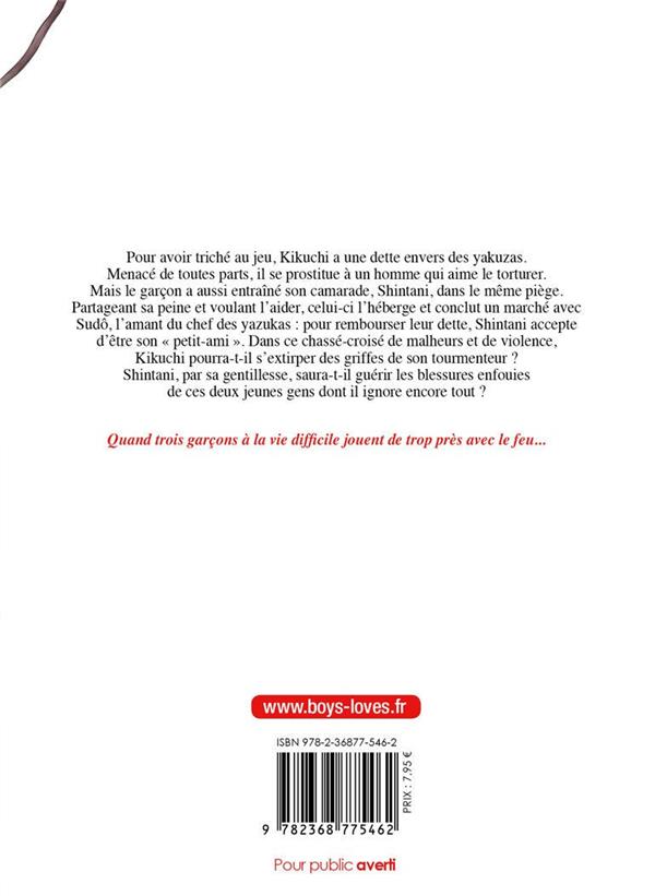Pour avoir triché au jeu, Kikuchi a une dette envers des yakuzas. Menacé de toutes parts, il se prostitue à un homme qui aime le torturer. Mais le garçon a aussi entraîné son camarade, Shintani, dans le même piège. Partageant sa peine et voulant l’aider, celui-ci l’héberge et conclut un marché avec Sudô, l’amant du chef des yakuzas : pour rembourser leur dette, Shintani accepte d’être son « petit-ami ».Dans ce chassé-croisé de malheurs et de violence, Kikuchi pourra-t-il s’extirper des griffes de son tourmenteur ? Shintani, par sa gentillesse, saura-t-il guérir les blessures enfouies de ces deux jeunes gens dont il ignore encore tout ?