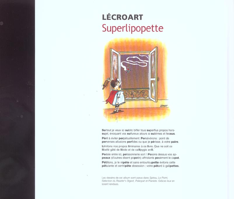 Loufoques, absurdes, incongrus mais surtout drôles, les dessins d’Etienne Lécroart nous entraînent dans le monde délirant de l’humour décalé au troisième degré. Créateur doux dingue, Lécroart nous avait déjà régalé aux Editions Glénat de Brigitte et Simon, Poil au cupidon, une chronique du couple hilarante, ainsi que de Machins Trucs, livre ayant reçu le Prix de l’Humour Noir 2003. Avec Superlipopette, il confirme sa place parmi les meilleurs humoristes d’aujourd’hui et de demain.