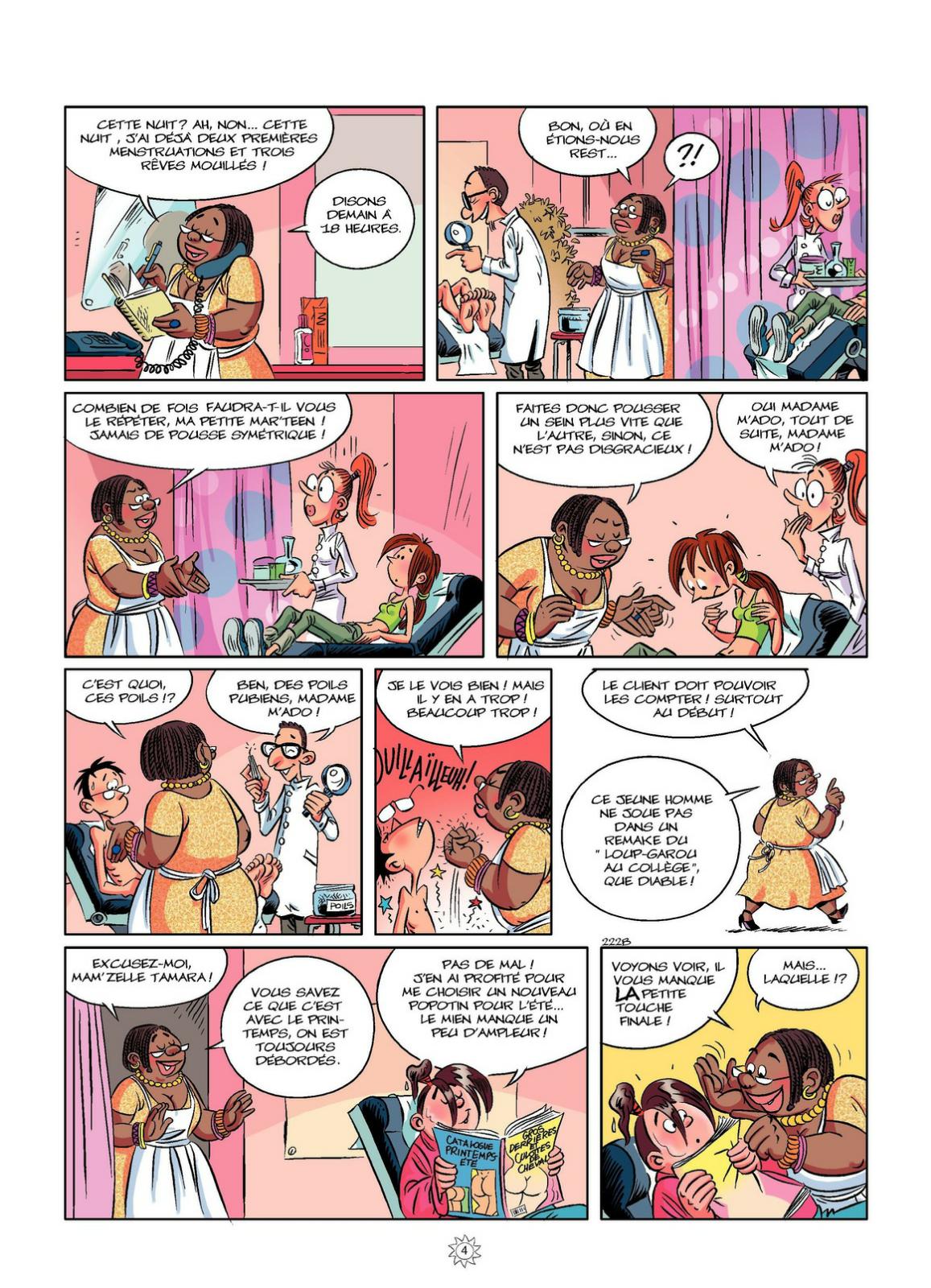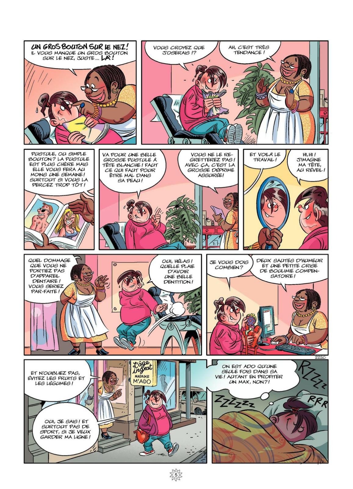 Tout d’abord, perdre du poids, donc manger moins de crasses...hum... ça va pas être de la tarte ! De la tarte...oh j’en ai déjà envie, et j’ai une de ces faims ! Non je ne peux pas, je dois résister, je dois perdre au moins 995 gr pour ne peser plus que 82 kg ! Ensuite, faudrait que je m’inscrive à un centre de fitness...mais bon, on verra ça plus tard ! Mais, surtout rencontrer un amoureux...Pas un « Wagner » ! lui, c’est un con ! Un crétin ! Un débile ! Et pas non plus un garçon comme mon père...celui-là, je ne sais pas ce qui me retient de... grmftr ! Non, un garçon doux, romantique...y a quand même moyen ! Je ne sais pas si les méthodes de Yoli sont vraiment efficaces : attraper un garçon au lasso, ou même un appeau pour garçons ?!! J’ai plutôt l’impression que je leur fais peur... oh mais oui... pourquoi je n’y ai pas pensé plus tôt ! Des tatoo’s ! je vais me mettre des tatoo’s partout et ils vont tomber comme des mouches, c’est sûr !