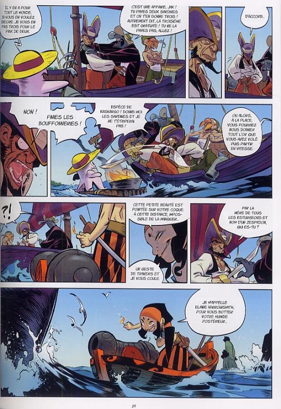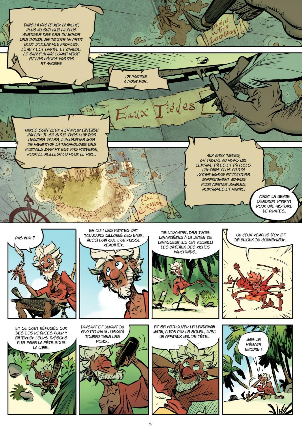 Plus un seul pirate aux Eaux Tièdes ? C’est ce que croit Poupo Mongrovejo, gouverneur tyrannique de ce lieu paradisiaque, bien décidé à faire disparaître la piraterie pour toujours. Mais c’est sans compter la résistance de certains irréductibles. Elaine, la jeune fille espiègle, et Encre Noire, le poulpe rose au grand c ?ur, préparent en secret leur navire pour écumer les mers et dérober des trésors. Parviendront-ils à reprendre le flambeau des premiers pirates, que les anciens appelaient « Tangomango » ?