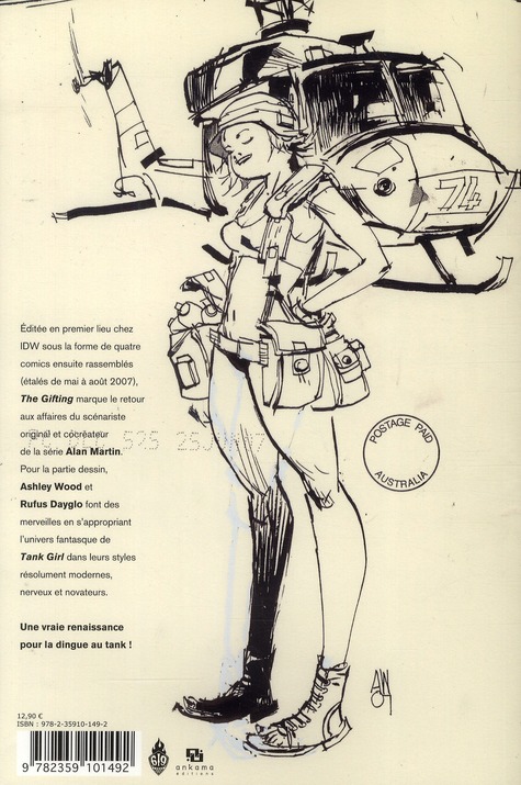 Inédit en France, Tank Girl : The Gifting a été publié entre mai et août 2006 chez IDW. Cette oeuvre célèbre le retour aux affaires du scénariste original et co créateur de la belle, Alan Martin. Pourla partie dessin, Ashley Wood et Rufus Dayglo font des merveilles en s’appropriant l’univers fantasque de la série dans leurs styles résolument modernes, nerveux et novateurs. Une virée drôle, irrévérencieuse au pays des Kangourou, et une véritable cure de jouvence pour la belle Tank Girl !