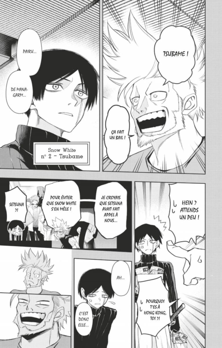 L’affrontement à Hong Kong atteint son apogée ! Abe doit affronter Pairu de Managarm et Tsubame de Snow White ! En infériorité numérique, il est mis en grande difficulté. A-t-il seulement une chance de les vaincre ?! Pendant ce temps, Tatari fait face à Muppet de Managarm, mais lorsqu’Aoi qui était partie sur ses traces fait irruption dans la bataille, il est alors assailli par le yokai de Muppet ! Puis, le duel tant attendu entre Tatari et Setsuna a enfin lieu !