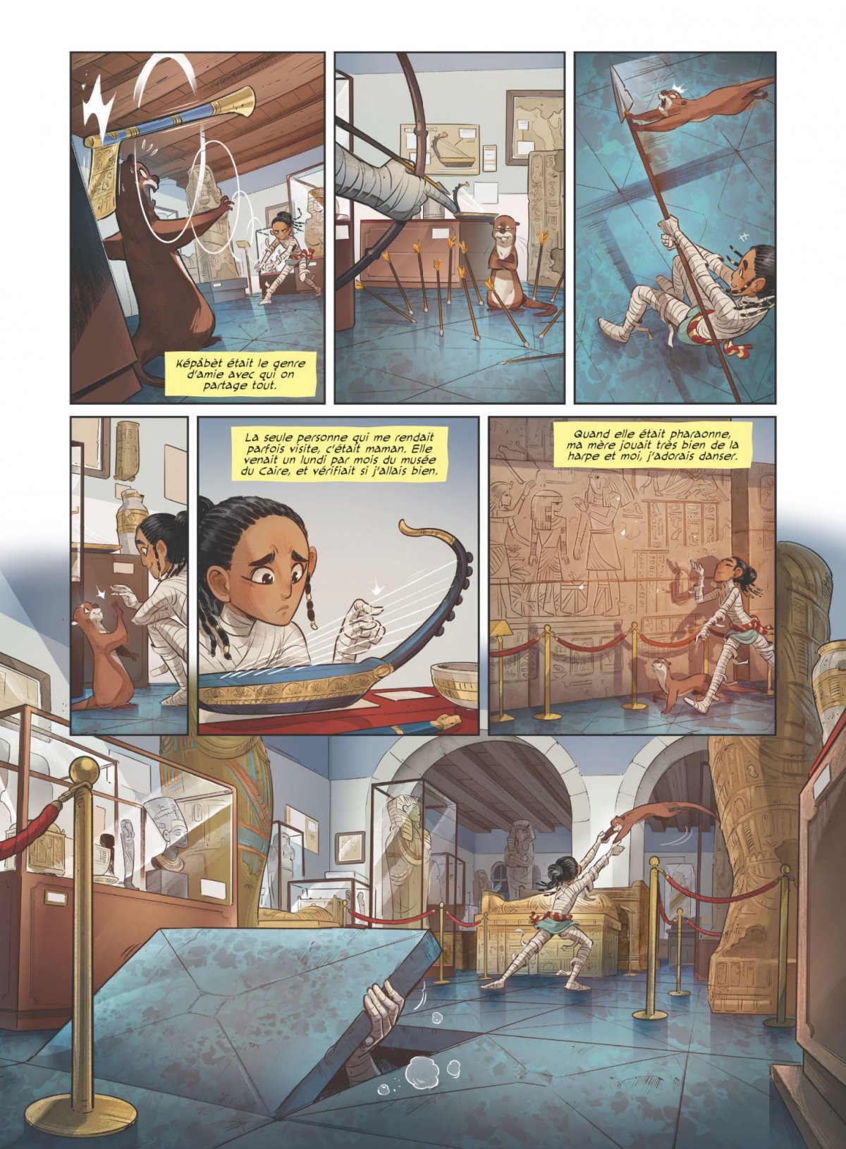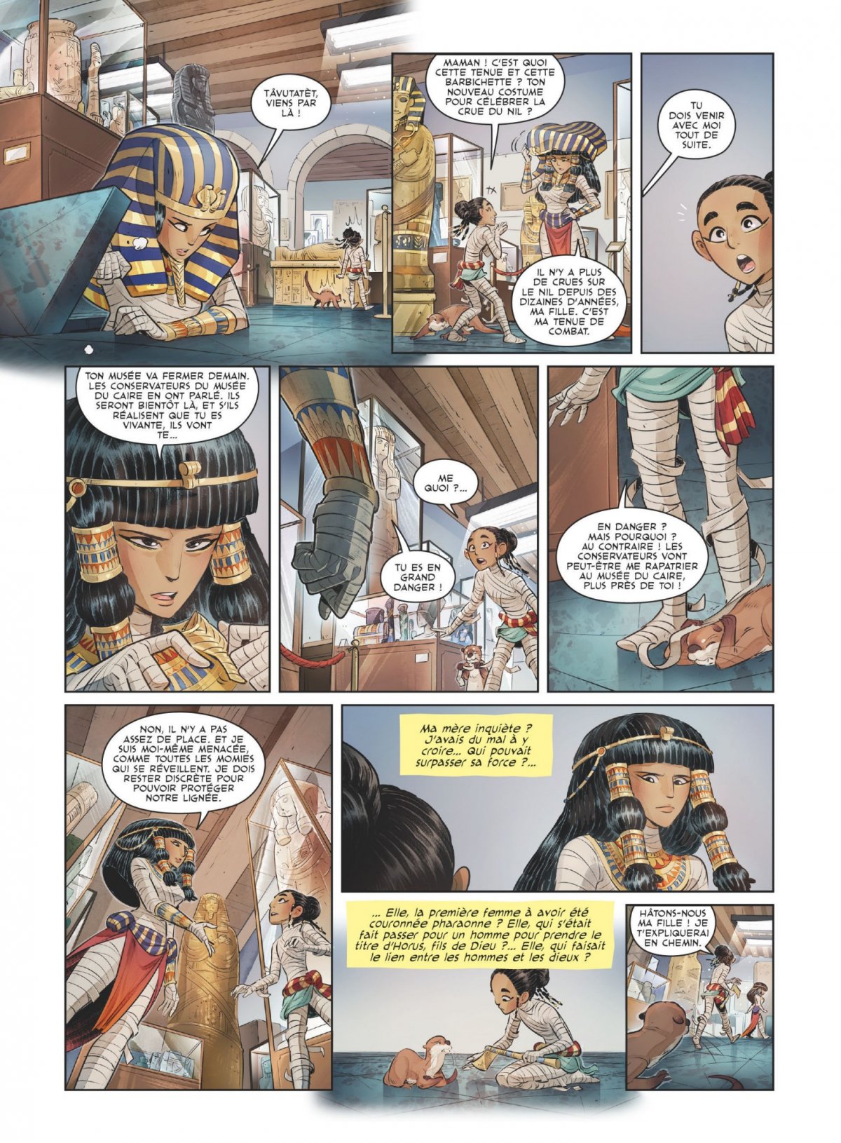 Être une momie exposée dans un musée, c’est amusant tant qu’il y a des enfants à qui sourire pendant la journée. Mais au fil des années, plus personne ne visite l’endroit. Et Tâvutatèt s’ennuie. Plutôt que d’attendre la venue de nouveaux touristes, elle rêve de découvrir le monde avec Képabèt, sa loutre et meilleure amie. Si seulement elle pouvait ne plus avoir à dormir dans ce vieux sarcophage, son lit depuis des siècles... Mais sa mère, célèbre pharaonne, lui a formellement interdit de mettre un pied dehors : il ne faudrait pas que les humains découvrent que la princesse Tâvutatèt est bien vivante ! Pourtant, un soir, cette même maman vient la chercher pour s’enfuir. L’inquiétude au fond du regard, l’ancienne Souveraine annonce à sa fille la fermeture imminente du musée et l’arrivée de « Mowlausses », un mystérieux groupe, dont la mission consiste à exterminer les êtres surnaturels. Débute alors un long et trépidant voyage pour notre jeune héroïne. Quittant l’Egypte, elle se rend jusqu’en Angleterre, où elle doit rejoindre un clan de créatures fantastiques pourchassées comme elle, mais pouvant la protéger.Avec Tavutatèt, plongez dans l’univers de l’Égypte ancienne et venez à la rencontre de personnages extraordinaires qui défient le temps et incarnent des légendes séculaires. Une nouvelle série jeunesse, au ton décalé, pleine d’aventure et de suspens. Un périple en deux tomes.