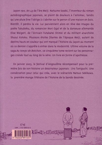 plusieurs étoiles filantes de l’époque meiji, autant de destins hauts en couleur qui ont marqué l’histoire du japon au moment où ce dernier s’apprête à entrer dans la modernité. ultime volume de la saga au temps de botchan, ce cinquième tome revient sur les personnages croisés tout au long de la série. un livre en forme d’apothéose. en janvier 2003, le festival d’angoulême récompensait pour la première fois de son histoire un dessinateur japonais : jiro taniguchi