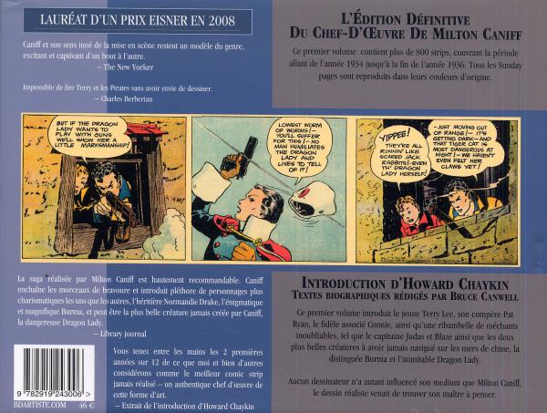 BD Artiste est heureuse de proposer la réédition intégrale et définitive en France de ce morceau de bravoure réalisé par Milton Caniff, 76 ans après le démarrage de Terry et les Pirates en VO. Ce premier volume de 400 pages compile les années 34 à 36 et bénéficie d’une nouvelle traduction signée Michel Pagel. En quelques années Milton Caniff, cet illustrateur talentueux devient un raconteur de génie, cet artiste que ses pairs ont surnommé le ’ Rembrandt du comic strip ’. Terry et les Pirates était lu par 31 millions de lecteurs entre 1934 et 1946. Dans ce premier volume, découvrez les premières aventures du jeune ’Terry Lee’, son coéquipier l’aventurier et protecteur ’Pat Ryan’, le fidèle ’Connie’, ainsi qu’une galerie inoubliable de brigands tous plus fourbes les uns que les autres tels que ’Capitaine Juda’ et ’Blaze’, ainsi que les 2 femmes les plus envoutantes jamais créés par Caniff, la distinguée et sublime ’Burma’ ainsi que la manipulatrice et redoutable ’Dragon Lady’.