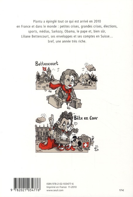 Plantu a épinglé tout ce qui est arrivé en 2010 en France et dans le monde : petites crises, grandes crises, élections, sports, médias, Sarkozy, Obama, le pape et, bien sûr, Madame Bettancourt et son affaire : bref, une année très riche.