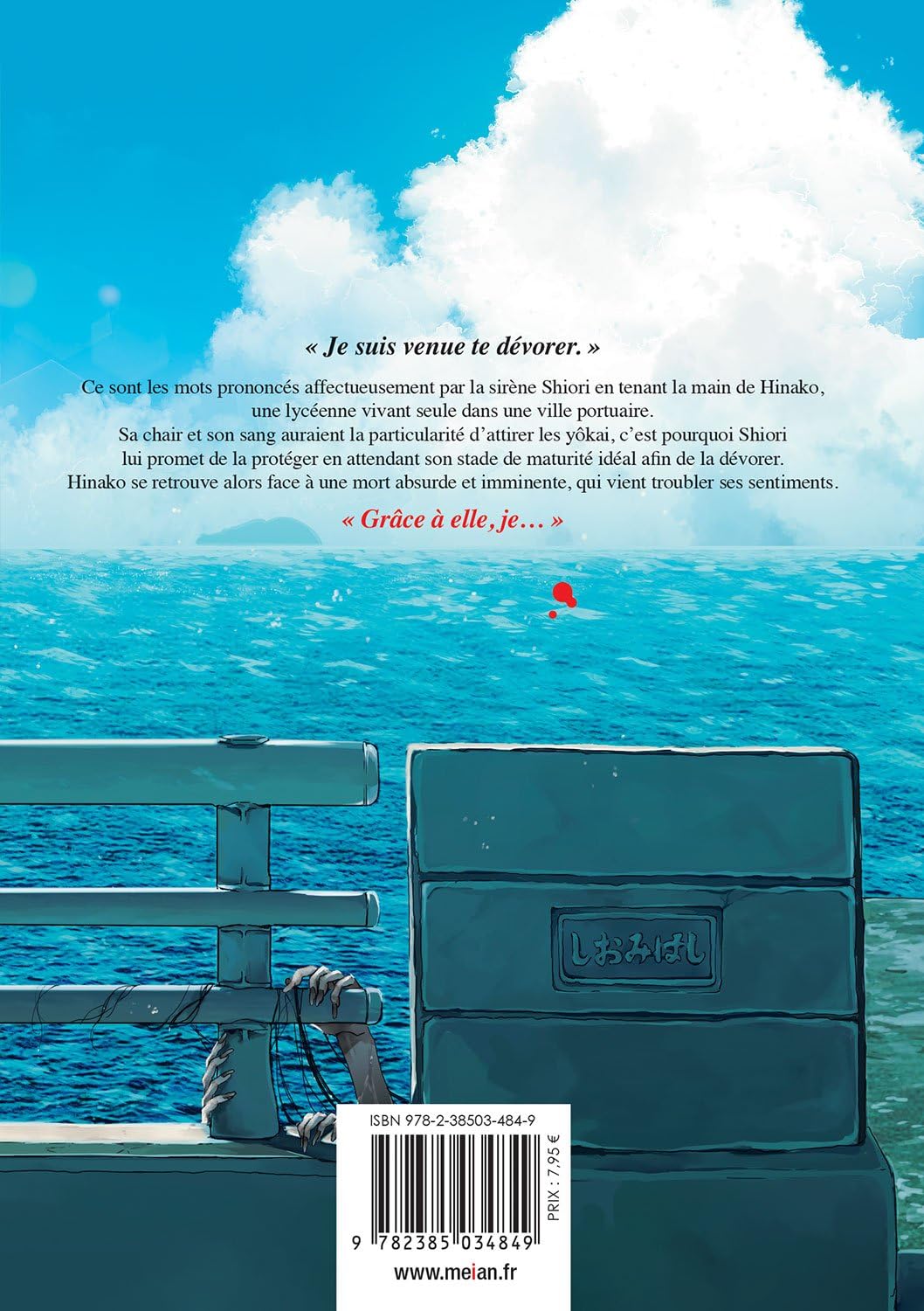Ce sont les mots prononcés affectueusement par la sirène Shiori en tenant la main de Hinako, une lycéenne vivant seule dans une ville portuaire. Sa chair et son sang auraient la particularité d’attirer les yôkai, c’est pourquoi Shiori lui promet de la protéger en attendant son stade de maturité idéal afi n de la dévorer. Hinako se retrouve alors face à une mort absurde et imminente, qui vient troubler ses sentiments.