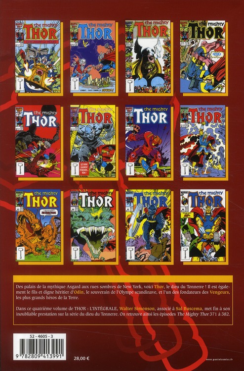 Voici le quatrième et dernier album des épisodes scénarisés par Walter Simonson, l’auteur de certaines des aventures les plus mythiques du dieu du Tonnerre, qui fera prochainement son apparition au cinéma. Au programme : Thor vs. l’Homme Absorbant, Fin Fang Foom, le Destructeur et bien d’autres menaces. Des palais de la mythique Asgard aux rues sombres de New York, voici Thor, le dieu du Tonnerre ! Il est égale-ment le fils et digne héritier d’Odin, le souverain de l’Olympe scandinave, et l’un des fondateurs des Vengeurs, les plus grands héros de la Terre. Dans ce quatrième volume de THOR : L’INTÉGRALE, Walter Simonson, associé à Sal Buscema, met fin à son inoubliable prestation sur la série du dieu du Tonnerre. On retrouve ainsi les épisodes The Mighty Thor 371 à 382.