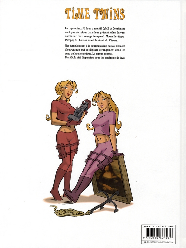 Cynthia et Cybille sont à peine remises des Années Folles que, déjà, les voilà reparties à la chasse aux pièces détachées à travers les âges. Le prochain morceau de la machine à remonter le temps, seule capable de les renvoyer chez elles, a été localisé à Pompéi... le 22 août 79 ! Soit deux jours avant la célèbre éruption du Vésuve... Une chose est certaine : Pompéi n’était prête ni pour supporter le volcan ni pour recevoir nos deux jumelles