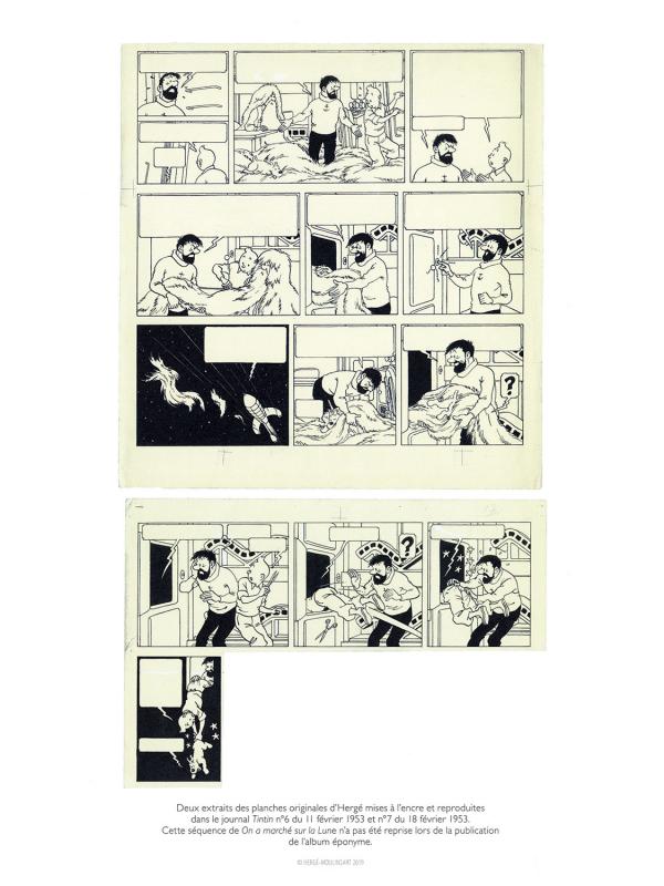 Se documentant rigoureusement, il s’entoure d’une équipe compétente et crée un récit visionnaire de 117 pages qu’il intitule On a marché sur la Lune. C’est cette version originelle publiée entre 1950 et 1953 dans le journal Tintin et parsemée de cases inédites que nous vous proposons de découvrir ici