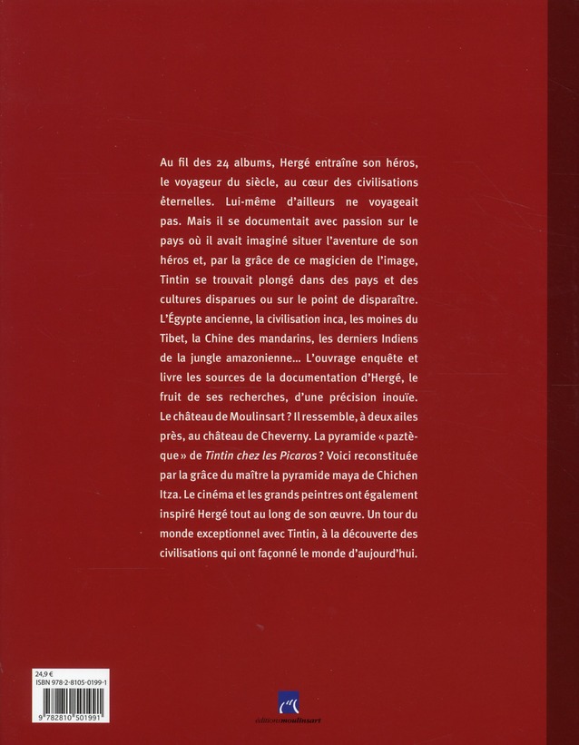 Au fil des 24 albums, Hergé entraîne son héros, le voyageur du siècle, au coeur des civilisations éternelles. Lui-même d’ailleurs ne voyageait pas. Mais il se documentait avec passion sur le pays où il avait imaginé situer l’aventure de son héros et, par la grâce de ce magicien de l’image, Tintin se trouvait plongé dans des pays et des cultures disparues ou sur le point de disparaître. L’Egypte ancienne, la civilisation inca, les moines du Tibet, la Chine des mandarins, les derniers Indiens de la jungle amazonienne... L’ouvrage enquête et livre les sources de la documentation d’Hergé, le fruit de ses recherches, d’une précision inouïe. Le château de Moulinsart ? Il ressemble, à deux ailes près, au château de Cheverny. La pyramide ’paztèque’ de Tintin chez les Picaros ? Voici reconstituée par la grâce du maître la pyramide maya de Chichen Itza. Le cinéma et les grands peintres ont également inspiré Hergé tout au long de son oeuvre. Un tour du monde exceptionnel avec Tintin, à la découverte des civilisations qui ont façonné le monde d’aujourd’hui.