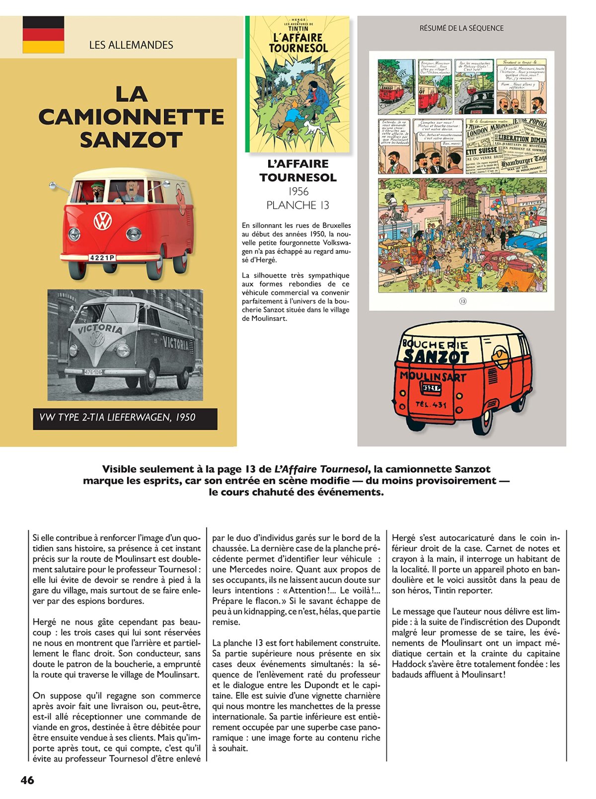 Chaque double page présente le modèle dans son contexte narratif, accompagné d’un document rare des archives d’Hergé, ainsi que du modèle réduit 1/24 de la collection Les voitures de Tintin coéditée par Moulinsart et Hachette Collections.