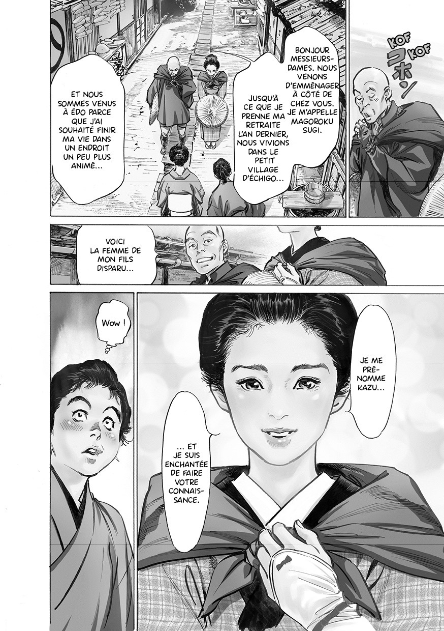 Japon, xixe siècle. Le fils de Magoroku Sugi, qui venait de lui succéder et d’épouser la jeune et jolie Kazu, meurt subitement de maladie. Le vieux patriarche n’a d’autre choix que de reprendre sa place de chef de clan et d’épouser Kazu à son tour. Ce couple pas comme les autres, que presque cinquante ans séparent l’un de l’autre, part s’installer à Edo (l’actuelle Tokyo) pour y refaire sa vie... Là, il apprend à s’aimer en même temps qu’il intègre la société locale, où les débauchés de tout poil sont légion