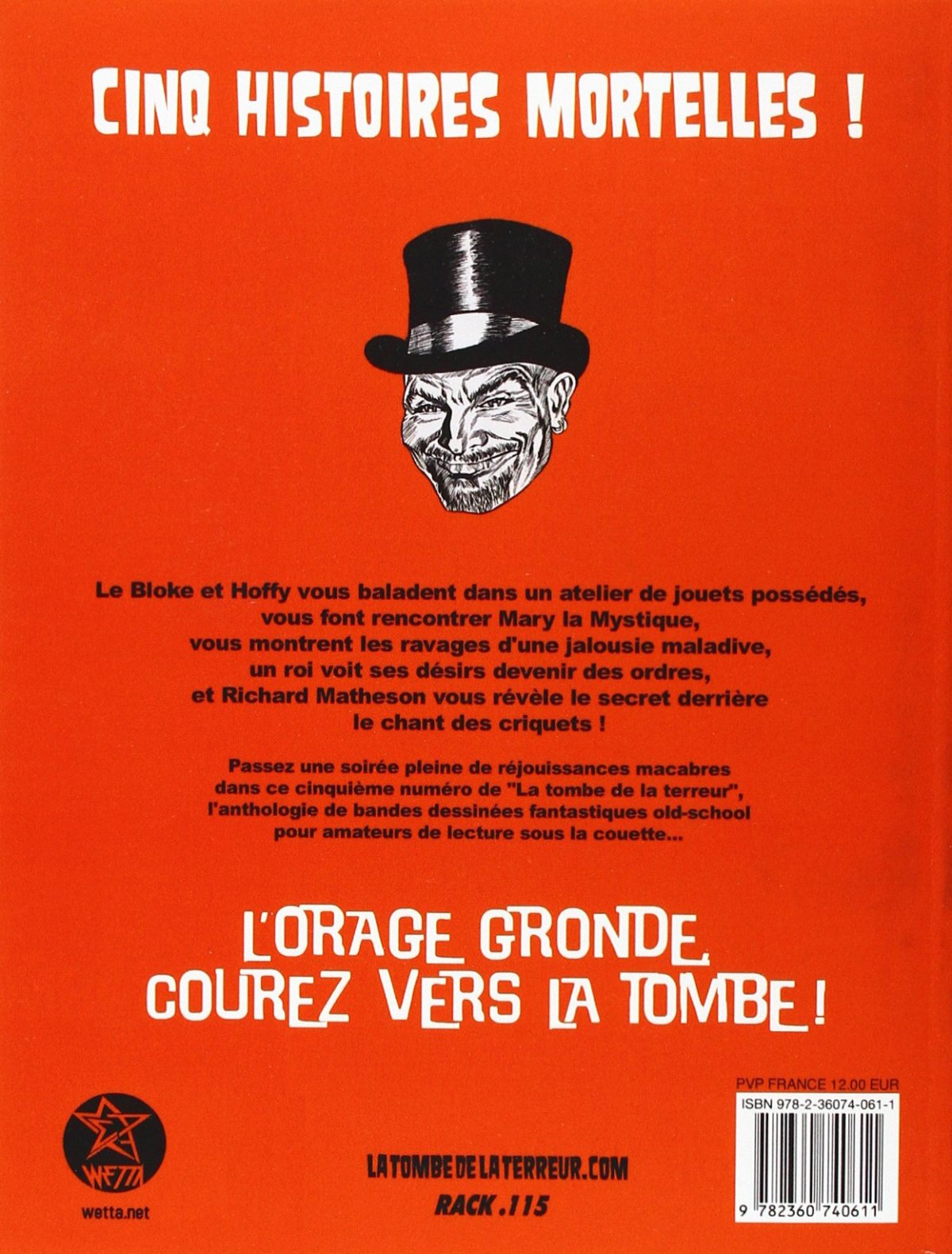 Le Bloke et Hoffy vous baladent dans un atelier de jouets possédés, vous font rencontrer Mary la Mystique, vous montrent les ravages d’une jalousie maladive, un roi voit ses désirs devenir des ordres, et Richard Matheson vous révèle le secret derrière le chant des criquets ! Passez une soirée pleine de réjouissances macabres dans ce cinquième numéro de La Tombe de la terreur, l’anthologie de bandes dessinées fantastiques old-school pour amateurs de lecture sous la couette.