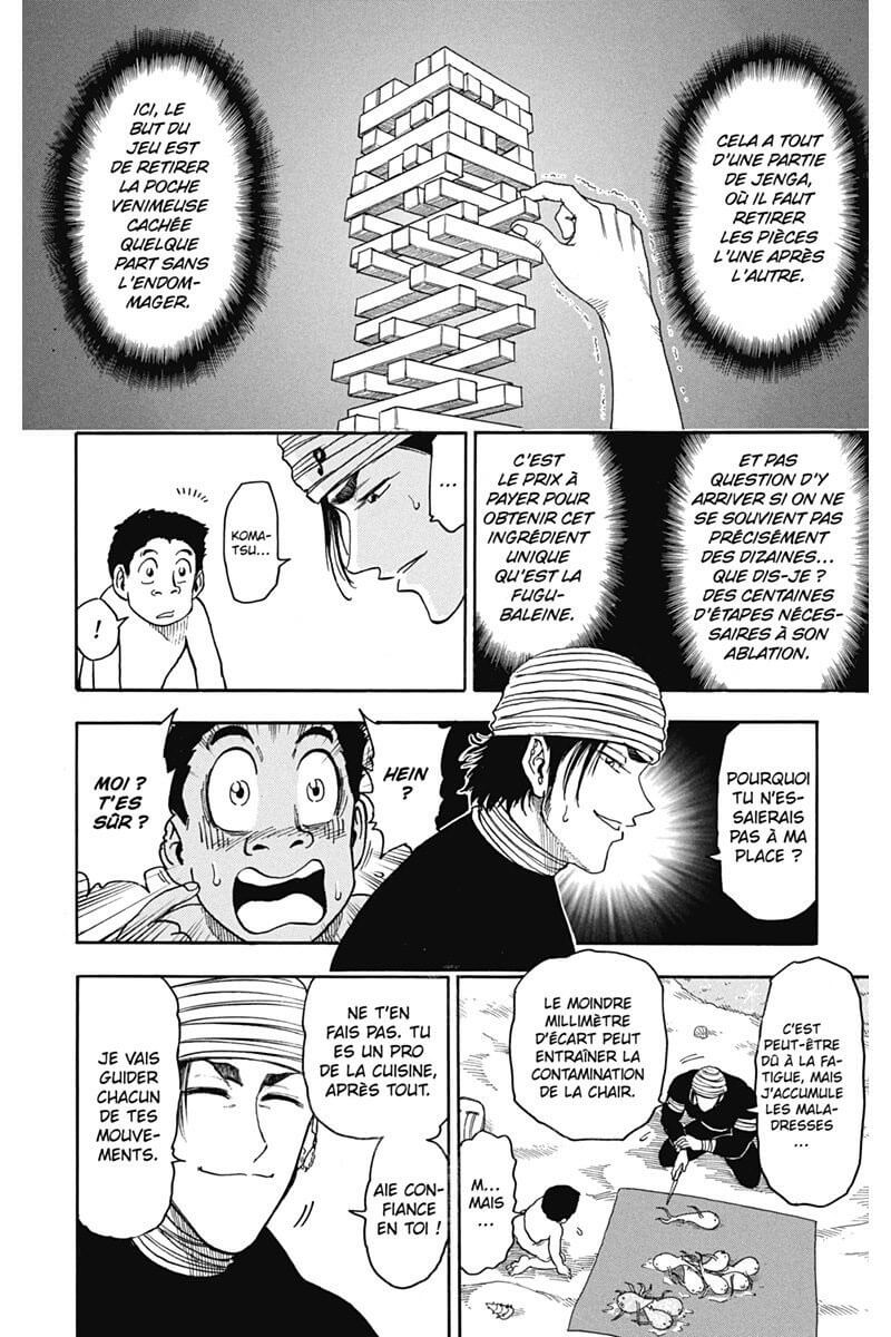 Grâce au talent de Komatsu, nos chasseurs de saveurs finissent par se délecter des fugu-baleines ! Mais alors qu’ils profitent tranquillement de leur pêche, une chose terrifiante remonte à la surface de la plage de sable souterraine. Une chose à laquelle même deux des Quatre Rois ne sont pas préparés. À l’extérieur de la grotte, la paix et l’ordre de la Gastronomie sont menacés par l’organisation ennemie de l’OIG : la terrible Gourmet Corp ?
