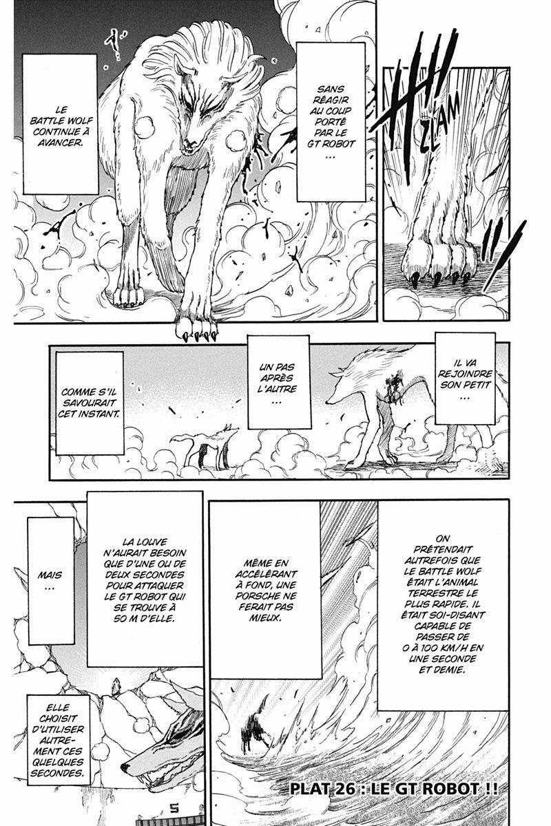 Le Gourmet Coliseum se transforme en véritable champs de bataille suite à l’intervention du mystérieux et surpuissant GT Robot. Ce dernier ayant abattu la vaillante Battle Wolf sous les yeux de son petit, Toriko entre dans une rage aussi folle que muette contre la machine. À mille lieues de ce terrible combat, Sunny, un autre des Quatre Rois, s’est lancé sur les traces du gargantuesque Mammouth Régal... Un trésor gustatif qui semble aussi intéresser l’impitoyable Gourmet Corp.