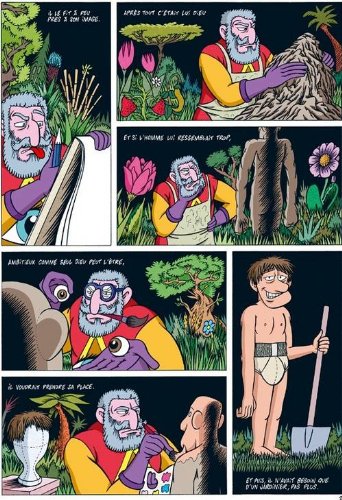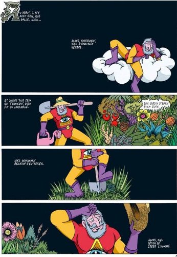 Au début, il y avait le néant. Dieu s’ennuyait. Alors, Il créa le jardin d’Eden et y fit du jardinage. Mais cela demandait beaucoup d’entretien. Alors, il créa un jardinier à peu près à son image : l’Homme. Seulement voilà : l’Homme était trop sociable pour ce grand solitaire de Dieu. Alors, il créa la Femme. Mais bien vite Dieu fut jaloux par leur attirance réciproque. Alors, Dieu créa l’Interdit et leur envoya le Serpent.Le Genèse revue et corrigée à la sauce érotico-burlesque, voilà ce que nous propose pour cette histoire en trois volumes Jean-François Caritte qui revient à un de ses thèmes fétiches : Adam et Eve. Donnant à Dieu le mauvais rôle, le rendant paresseux, jaloux mais aussi voyeur, envieux, cynique et odieux. Bref, le rendant (presque) humain.