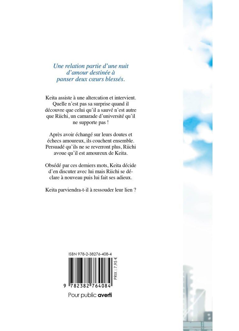 Une relation partie d’une nuit d’amour destinée à panser deux coeurs blessés. Keita assiste à une altercation et intervient. Quelle n’est pas sa surprise quand il découvre que celui qu’il a sauvé n’est autre que Riichi, un camarade d’université qu’il ne supporte pas ! Après avoir échangé sur leurs doutes et échecs amoureux, ils couchent ensemble. Persuadé qu’ils ne se reverront plus, Riichi avoue qu’il est amoureux de Keita. Obsédé par ces derniers mots, Keita décide d’en discuter avec lui mais Riichi se déclare à nouveau puis lui fait ses adieux. Keita parviendra-t-il à ressouder leur lien ?