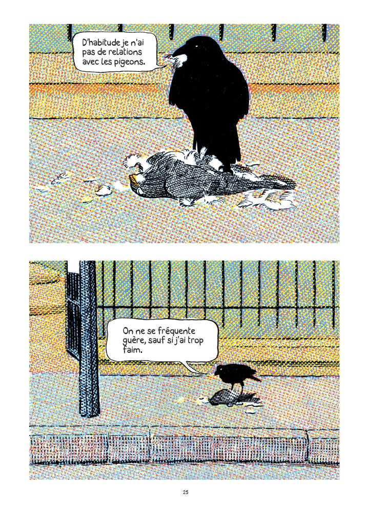Il reprend pour ce faire le procédé si original et poétique déployé dans Acte de Dieu de l’enchaînement et du croisement des regards et points de vue. La vision d’une corneille a la même valeur que celle d’une petite fille, le Parc des Buttes-Chaumont comme le piège à corneilles deviennent des protagonistes à part entière. Selon Giacomo Nanni, le but de cette histoire n’est "pas seulement de raconter la violence d’un attentat terroriste, mais aussi d’évoquer la brutalité des faits par rapport à linvention littéraire et artistique"
